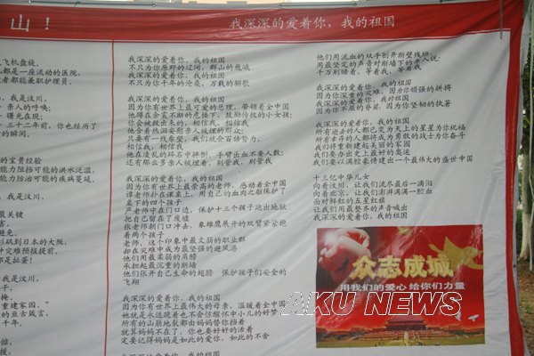 同时,艺术系08级设计专业的同学们,结合专业课程的教学类容,采用装置艺术的形式,以悬挂的一百把雨伞,寓意着天堂,表达真爱,人间有真爱,有真爱就有天堂;以三百六十五根蜡烛,代表着三百六十五个日日夜夜,表示着三百六十五天的牵挂,表达着三百六十五个祝福,祝愿在天堂的灵魂得到安息,祝愿人间真爱长存,祝愿汶川的明天依旧美丽。师生们校园中举行的各种活动也吸引了众多家属的参与。