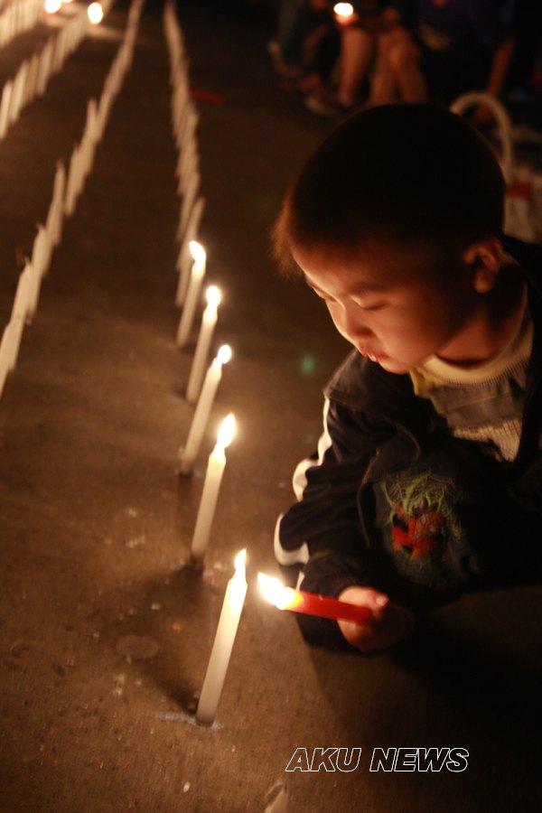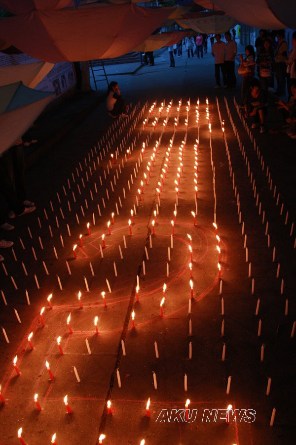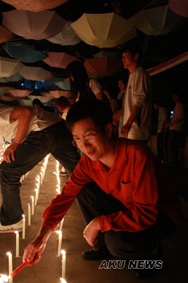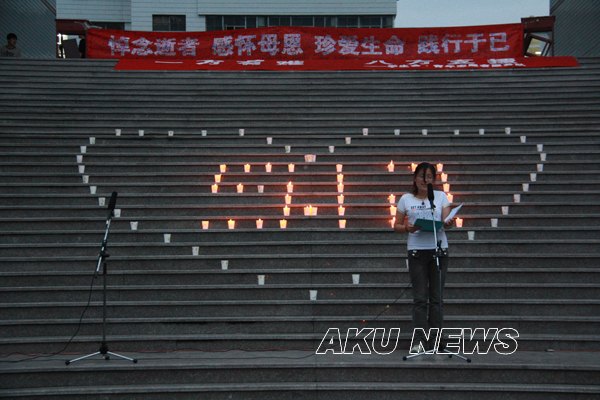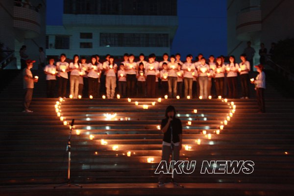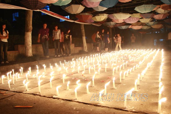 晚上7:00,由大学生记者团、青年志愿者服务队组织的“悼念遇难同胞诗歌朗诵会暨默哀仪式”在东校区一号教学楼前举行。同学们用一首首诗歌传递着对灾区人民的浓浓爱意。一名来自四川灾区的同学点燃了第一根蜡烛,将这汇集了哀思与祝福的蜡烛传递到了师生手中,瞬时,烛光聚成了一个大大的心形,代表着安康学院人和灾区人民心连心。