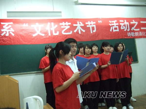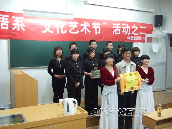 为庆祝建国60周年,由团委主办,外语系团总支承办的第二届“文化艺术节”系列活动之二――“青春与祖国同行”诗歌朗诵比赛5月24日晚在六号教学楼多媒体教室举行。