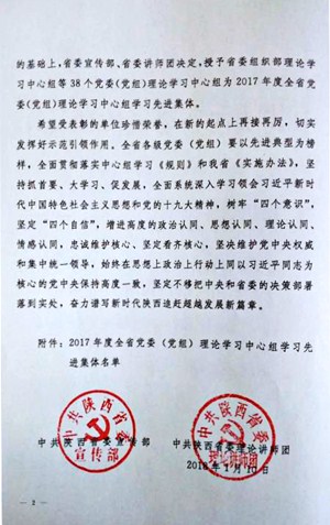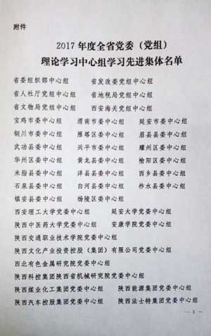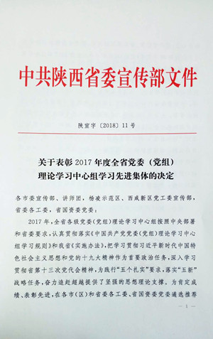 近日,省委宣传部公布《关于表彰2017年度全省党委(党组)理论学习中心组学习先进集体的决定》(陕宣字〔2018〕11号),我校党委理论学习中心组被评为2017年度全省党委(党组)理论学习中心组学习先进集体。