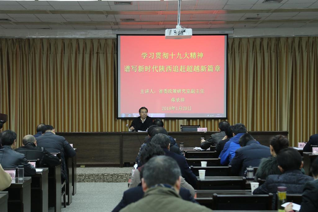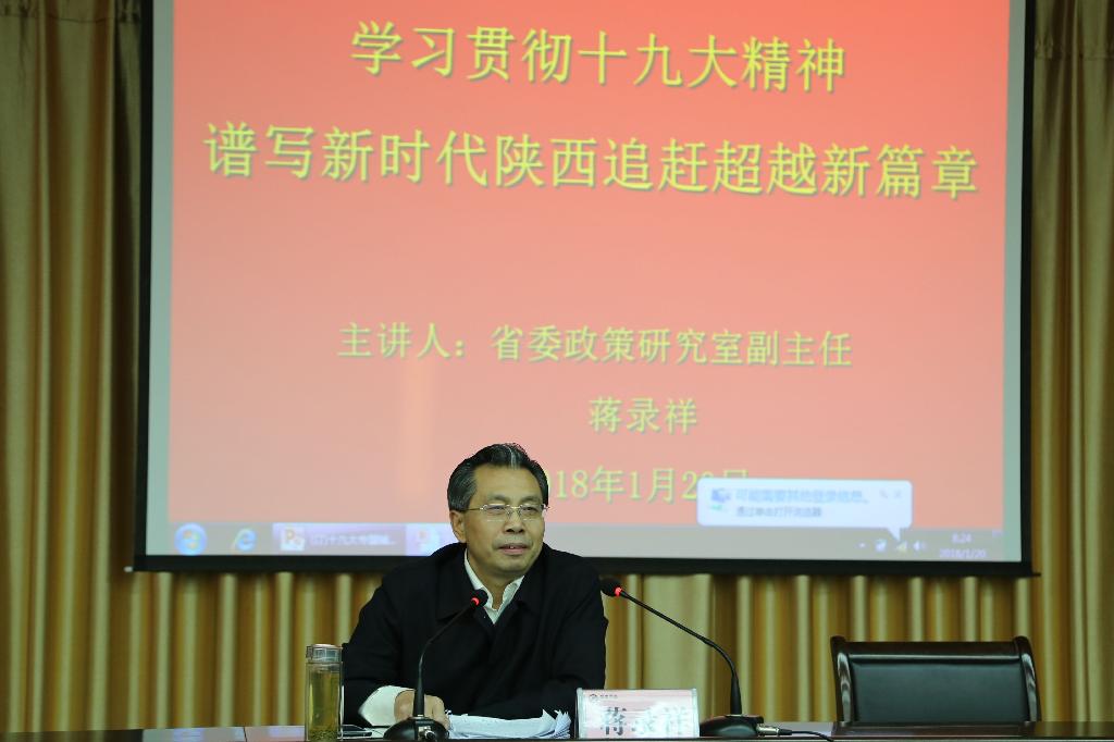 培训班第一讲邀请陕西省委政策研究室副主任蒋录祥教授以《学习贯彻十九大精神,谱写新时代陕西追赶超越新篇章》为题,作了专题辅导报告。党委副书记、纪委书记闵小平主持报告会。