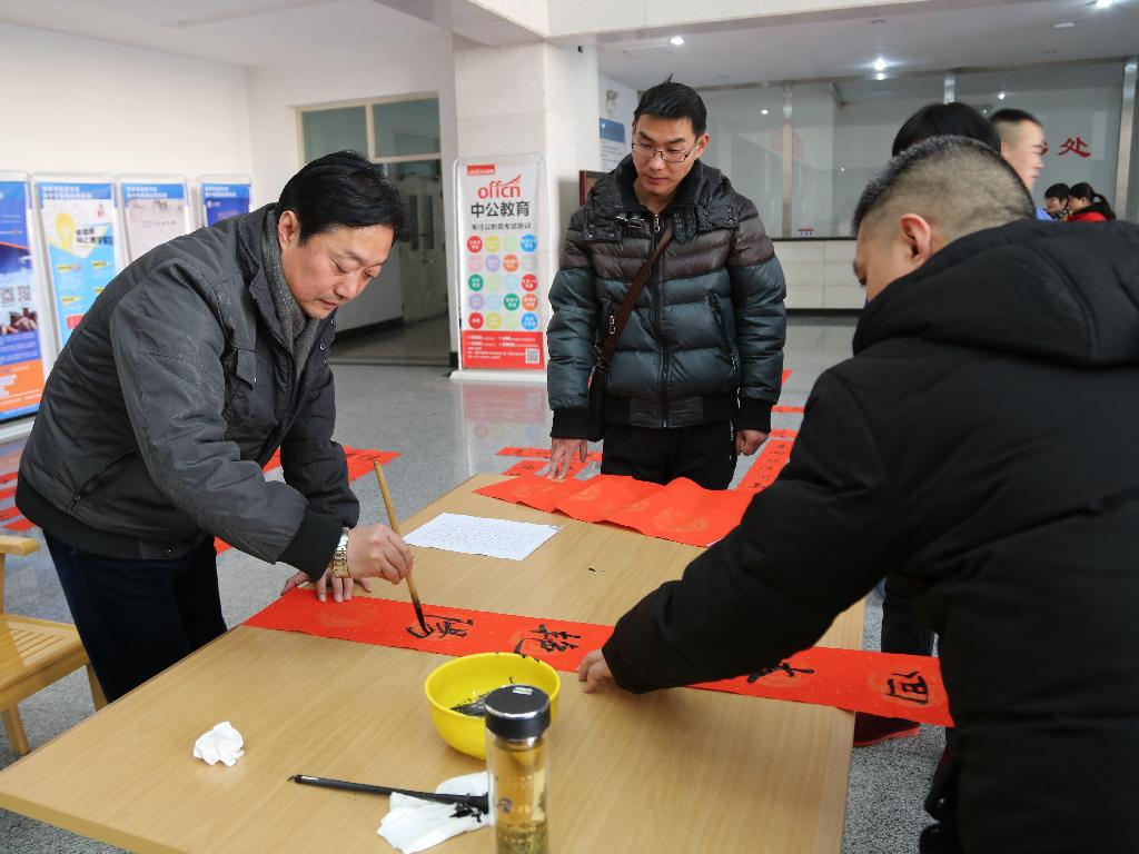 活动现场,“佳节迎春春生笑脸 丰收报喜喜上眉梢”、“百世岁月当代好 千古江山今朝新” 、“民安国泰逢盛世 风调雨顺送华年”……一张张洒金红纸上满是教工的心愿、新春的祝福。广大教职工精心选择自己心仪的祝福话语,书法家们挥毫泼墨,墨香伴着幸福的笑脸为校园提前增添了浓浓的年味。