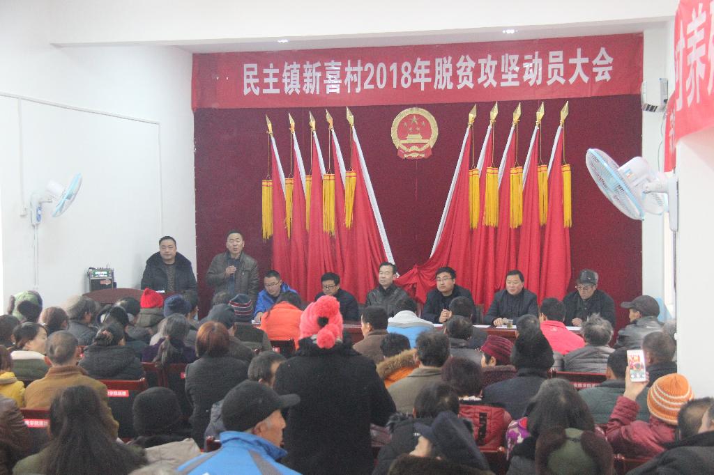 动员大会在新喜村新落成的村民活动室召开。民主镇党委书记吴明刚作了动员讲话。胡波代表学校向村民们及奋战在扶贫一线的工作队员们表示慰问并送上新春的祝福,表示学校在2018年将进一步加大帮扶力度,与各级政府和全体村民共同努力,为实现整村脱贫目标而奋斗。扶贫工作队对新喜村2017年度扶贫工作进行了总结,并对2018年度工作进行了部署和安排。
