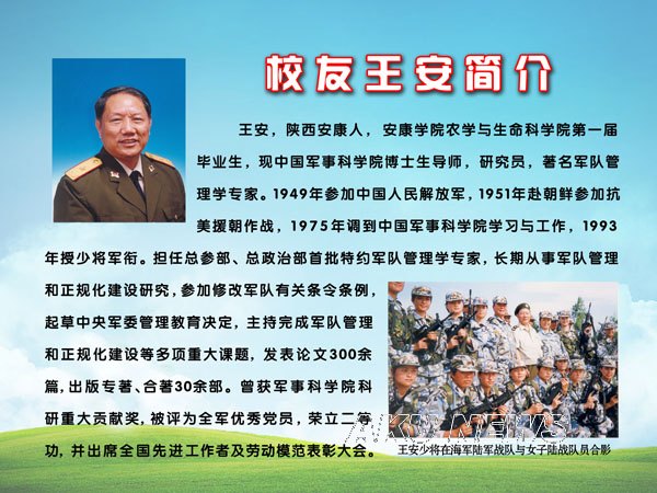 王安将军是我校农学与生命科学院第一届毕业生,现为中国军事科学院研究员、博士生导师,著名军队管理学专家。1991年获准享受政府特殊津贴,1993年授少将军衔。长期从事军队管理、带兵、条令条例和正规化建设研究,参加修改有关条令条例、起草中央军委管理教育决定,主持完成军队管理和正规化建设等多项重大现实课题,发表论文300余篇,出版专著、合著30余部,曾获军事科学院科研重大贡献奖,并出席全国先进工作者及劳动模范表彰大会。