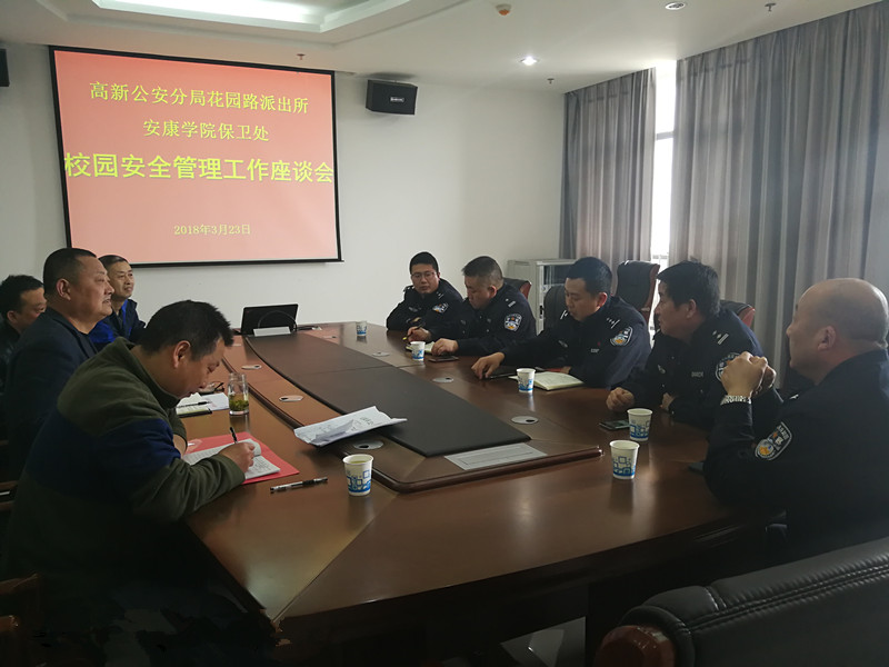近日,我校在江北校区逸夫科技楼小会议室召开了校园安全管理座谈会。安康市公安局高新分局治安大队副队长吕建成,花园派出所副所长王西宁、刘勇,片区民警汪成斌和我校保卫处科级以上干部出席座谈会,双方就校园警务室建设、周边环境治理、校园治安防控体系建设、学生安全教育等方面进行座谈交流。