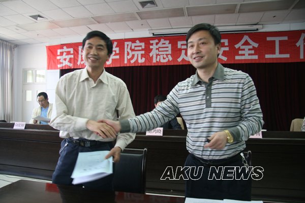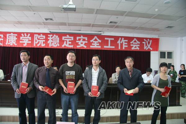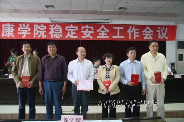 学院领导为获得表彰的先进集体和先进个人颁发了荣誉证书。获表彰先进集体在大会上做了经验交流。杨涛代表学院与各院系、各部门签订了《安康学院稳定安全目标管理责任书》。