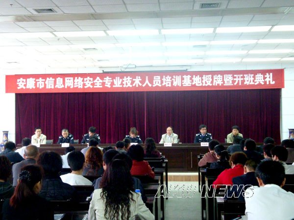 我院党委委员、副院长杨行玉,陕西省公安厅网监总队副总队长高水秦,陕西省公安厅网监总队管理队队长刘战胜,陕西省公安厅网监总队网吧协会会长刘尧,安康市公安局网监支队支队长王朝辉及我院继续教育学院领导出席了授牌暨首期培训班开班仪式。仪式上高副总队长代表省公安厅授予我院陕西省安康市信息网络安全专业技术人员继续教育培训基地,委托我院继续教育学院负责安康市信息网络安全类、信息网络安全技术类和互联网信息内容安全管理类及互联网上网服务业务营业场所安全管理类培训工作。