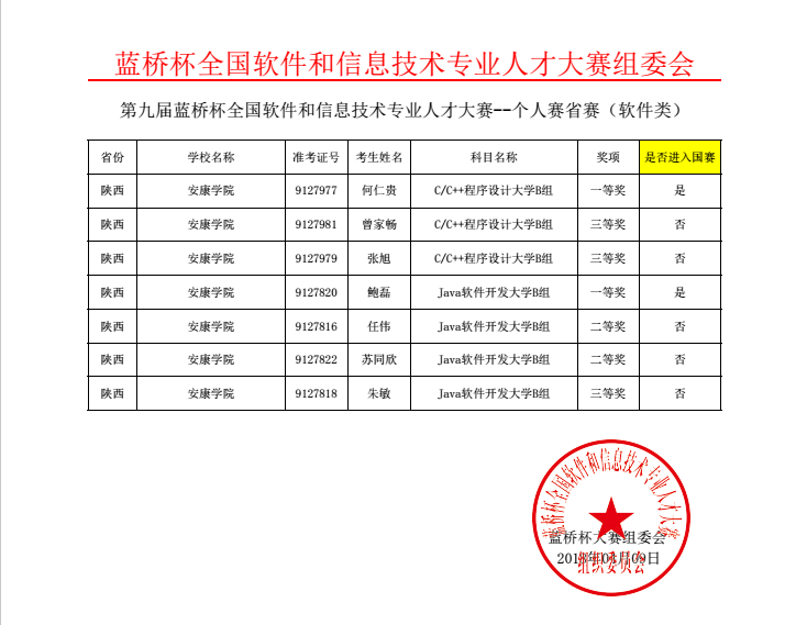 近日,在第九届“蓝桥杯”全国软件和信息技术专业人才大赛省赛中,我校电信学院9名学生参加大赛,最终获C程序设计大学B组一等奖1名,三等奖2名;获JAVA程序设计大学B组一等奖1名,二等奖2名,三等奖1名。何仁贵、鲍磊两位学生将代表学校参加5月底在北京举行的第九届“蓝桥杯”全国总决赛。