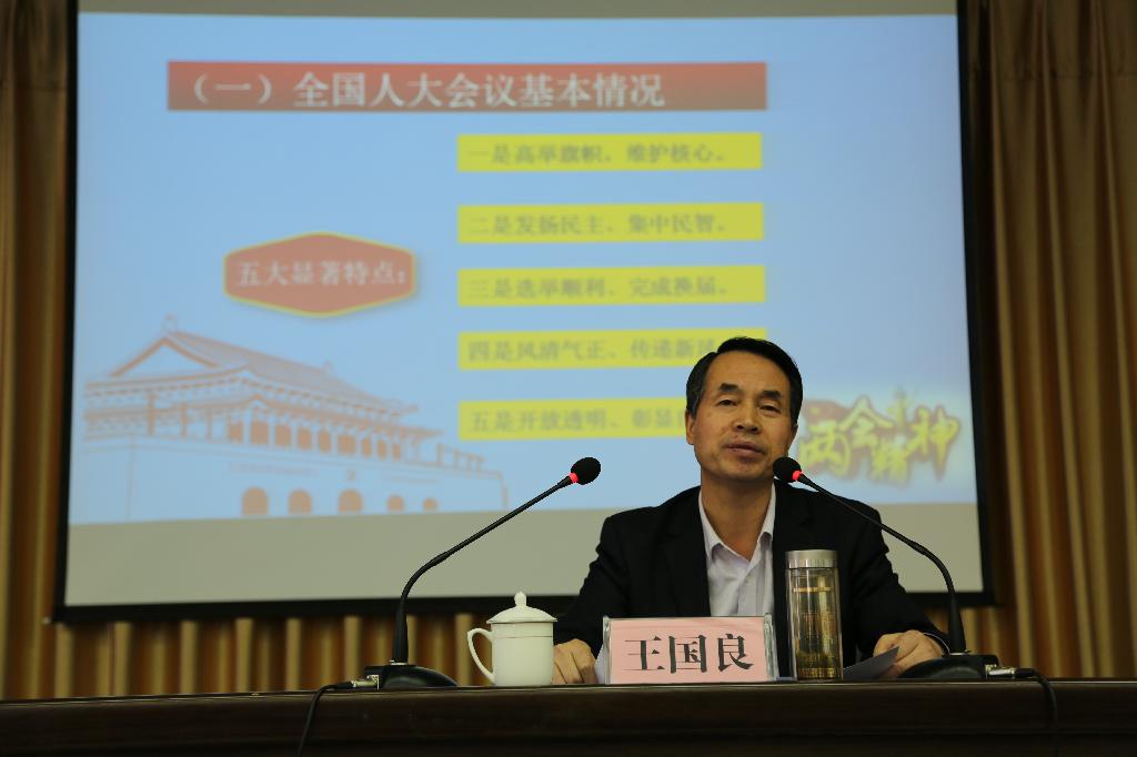 会上,王国良同志图文并茂、生动详实地传达了十三届全国人大一次会议和全国政协十三届一次会议精神。从全国两会的概况、中央领导同志重要讲话精神、宪法修正案、监察法、几个工作报告及国务院机构改革方案等六个方面,为与会同志做了全面深入的学习辅导报告。王国良在报告中指出,刚刚胜利闭幕的全国两会,是在全面贯彻党的十九大精神开局之年、改革开放40周年、决胜全面建成小康社会关键之年召开的重要会议,是一次民主、团结、求实、奋进的大会,对于动员全党全国各族人民为夺取新时代中国特色社会主义伟大胜利而不懈奋斗,具有重大而深远的意义。他强调学习贯彻全国两会精神是当前全校上下的一项重要政治任务,各二级单位务必要精心安排部署,迅速组织学习,切实把思想和行动统一到中央决策部署上来,把智慧和力量凝聚到新时代追赶超越上来。他要求要把学习贯彻习近平总书记重要讲话作为重中之重,要抓好贯彻落实工作。要自觉用全国两会精神武装头脑、指导工作,结合我校办学实际,推动全校各项工作取得新进展,为加快建设经济繁荣、社会文明、生态宜居、人民幸福的美好新安康做好担当。