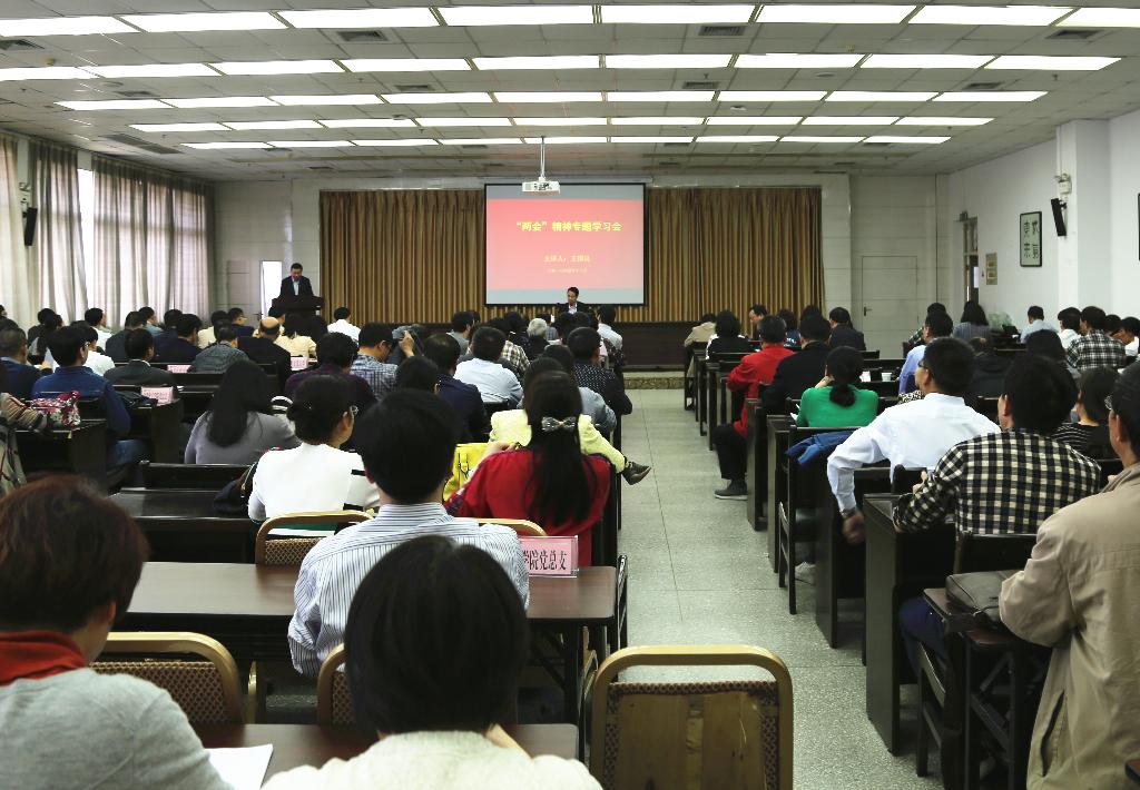 为深入学习贯彻第十三届全国人大一次会议和全国政协十三届一次会议精神,准确把握“两会”的精神实质和内容,4月18日下午,我校在江南校区图书馆六楼报告厅召开了全国“两会”精神专题学习会。学校党委委员、纪委委员、学术委员会委员、工会委员,副高以上职称专业技术人员,副处级以上领导干部,市级以上人大代表、政协委员,民主党派主要负责人参加了学习会。学校党委书记王国良做了专题报告。会议由党委副书记胡波主持。