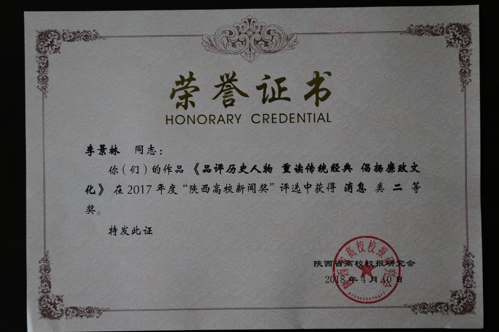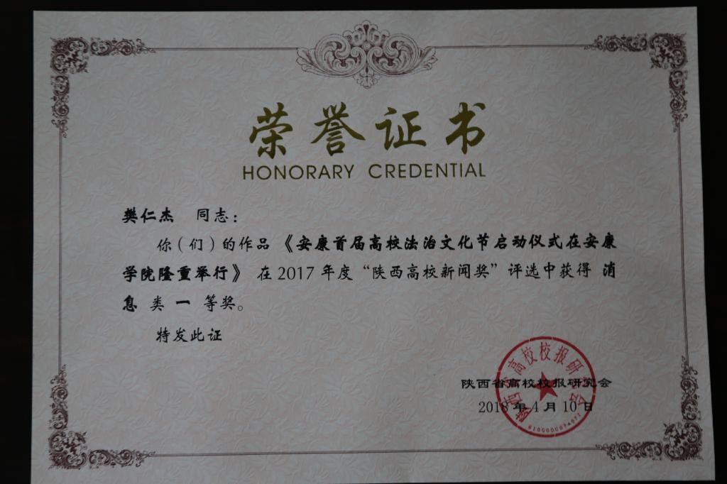 近日,2017年度“陕西高校新闻奖”获奖结果揭晓,我校2件作品榜上有名,其中樊仁杰《安康首届高校法治文化节启动仪式在安康学院隆重举行》获消息类一等奖,李景林《品评历史人物 重读传统经典 倡扬廉政文化》获消息类二等奖。