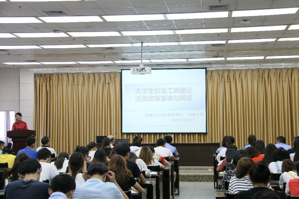 为增强大学生创新创业意识,了解商事登记改革相关政策,为校园的创新创业者提供“零距离”服务,6月6日下午,安康市工商行政管理局局党组成员、副局长申林斌同志带领注册分局、商标科共计6名工作人员在我校江南校区图书馆六楼学术报告厅做了主题为“大学生创业工商登记注册政策宣讲与解读”的报告会。招就处处长丁义国、副处长常权记,各二级学院辅导员,大学生创新创业协会学生以及有创业意愿的学生代表共200余人参加了讲座。讲座由校友工作办公室主任田静主持。