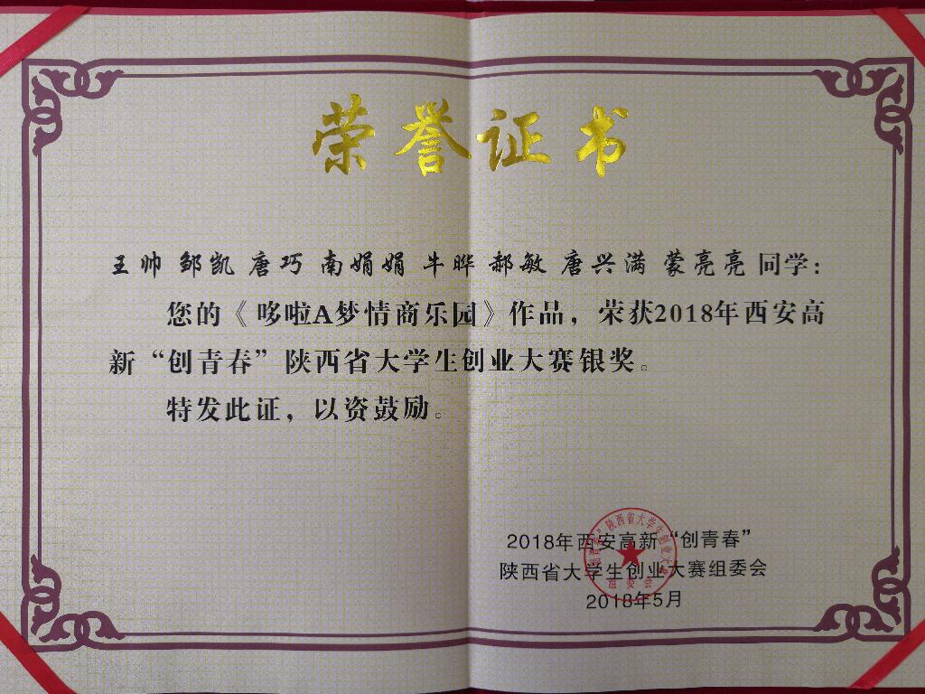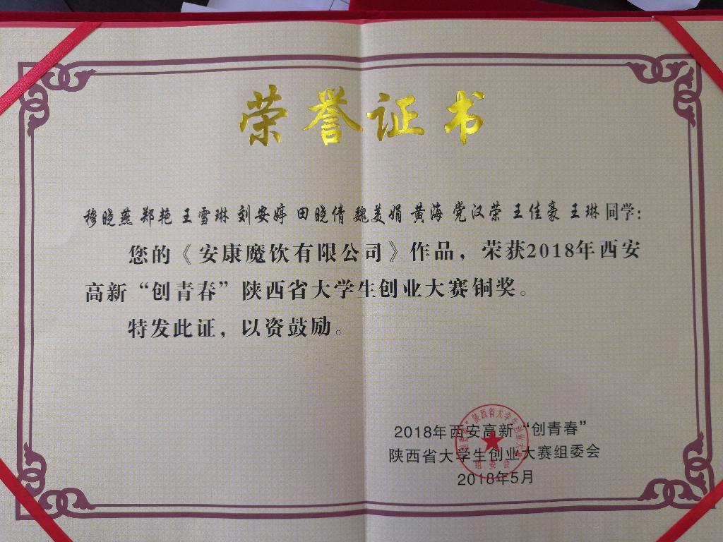 近日,2018年西安高新“创青春”陕西省高校大学生创业大赛暨“挑战杯—彩虹人生”陕西省职业学校创新创效创业大赛终审决赛成绩公布。由我校化学化工学院王硕老师指导,王帅、邹凯等同学完成的《哆啦A梦情商乐园》获大赛银奖,由农生学院朱新鹏老师指导,穆晓燕、郑艳等同学完成的《安康魔饮有限公司》获大赛铜奖。