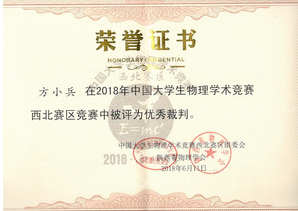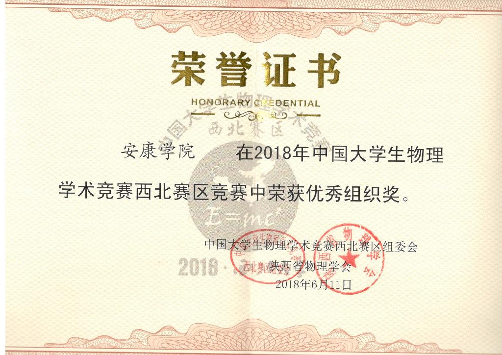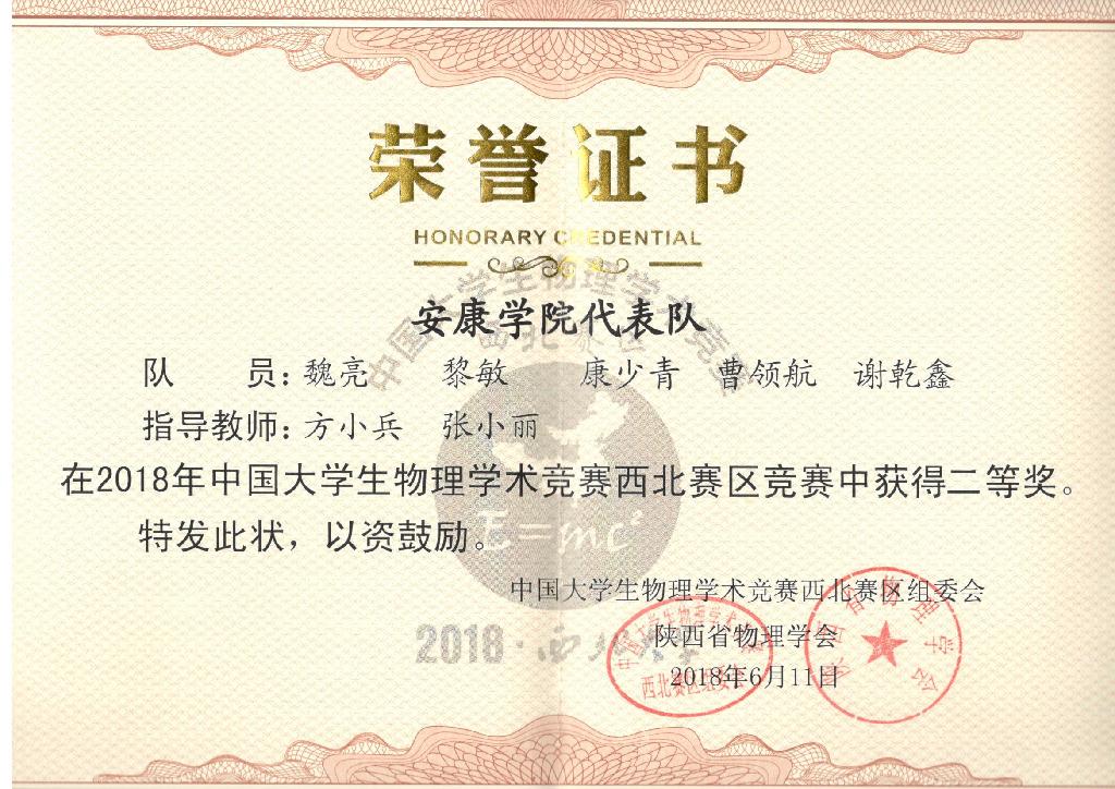 6月9日至11日,2018年中国大学生物理学术竞赛西北赛区竞赛在西北大学隆重举行。我校由方小兵、张小丽指导,魏亮、黎敏、康少青、曹领航、谢乾鑫等5名电信学院物理系学生组建的代表队获得二等奖,方小兵被评为优秀裁判,我校被授予优秀组织奖。