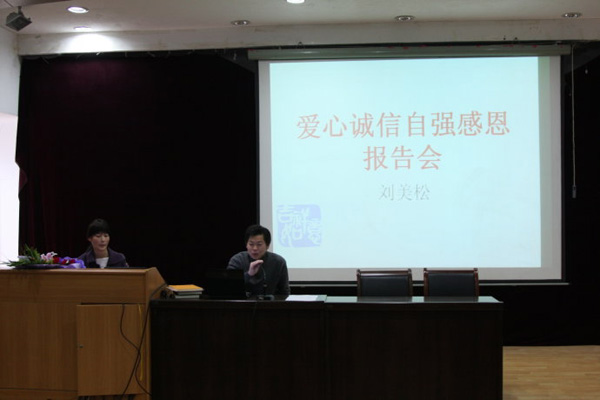 诚实守信,懂得感恩,自强不息,奉献爱心是中华民族的美德。化学化工系在学生干部培训活动中,注重创新形式,充实内容,通过讲述我们身边的例子,来加强学生的爱心诚信自强感恩教育,2010年10月30日上午10点,化学化工系特别邀请了“诚信百日行”活动发起人、中国作家协会会员刘美松在安康学院一号楼六楼报告厅,为学生举行了“爱心诚信,自强感恩”报告会,收到了很好的效果。参加报告会的有安康学院学生部长郑树清,团委书记鲁延安,石泉县原县长张茂南,农业局办公室主任张涛,化工系党总支书记张立虎,副主任王浩东,部分教师代表和化工系学生二百余人。化学化工系基础教研室主任周琼老师主持了报告会。