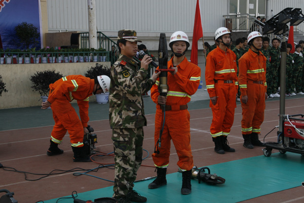 在演练活动上,副院长陈刚做了动员讲话。安康公安消防支队消防处参谋李波同志给师生详细讲解了防火、灭火、自救、逃生、疏散等方面的知识和技巧;汉滨消防中队的战士们给广大师生讲解演示了十余种消防特种器材的构造和使用方法,进行了穿越火墙表演;随后,进行了现场灭火演练,校卫队员、部分管理服务部门教工、学生代表亲自实践了灭火器的使用;60余名学生护校队员和205名新生在学生宿舍4号公寓楼参加了 “模拟火灾”疏散演练。最后,省消防总队副总工程师任清杰同志点评了本次消防演练活动,对我院的消防安全工作给与了充分的肯定,同时希望师生进一步深入学习消防法律、法规,强化消防安全意识,增强师生防火疏散逃生能力,推进平安校园建设。