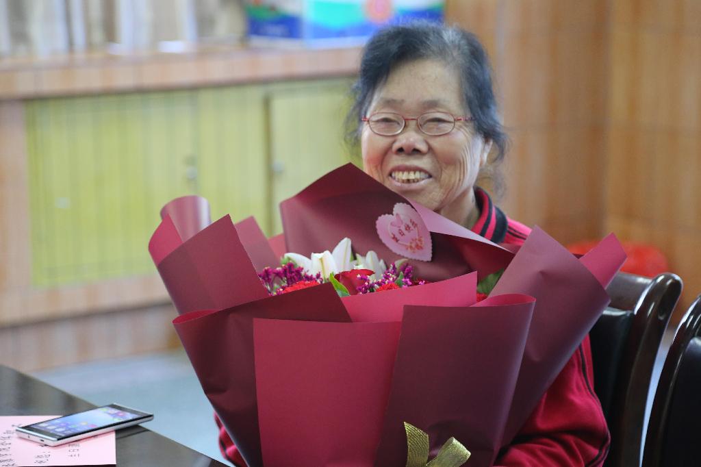 老寿星代表、原学校纪委书记薛荫蕙致答谢词。她代表离退休同志感谢学校一直以来对大家的关心与厚爱,感谢在学校发展最困难的时候也没有让离退休职工的福利受到影响。她表示,请学校放心,离退休同志定会一如既往关心爱护学校,支持学校发展,相信学校的明天会更好。