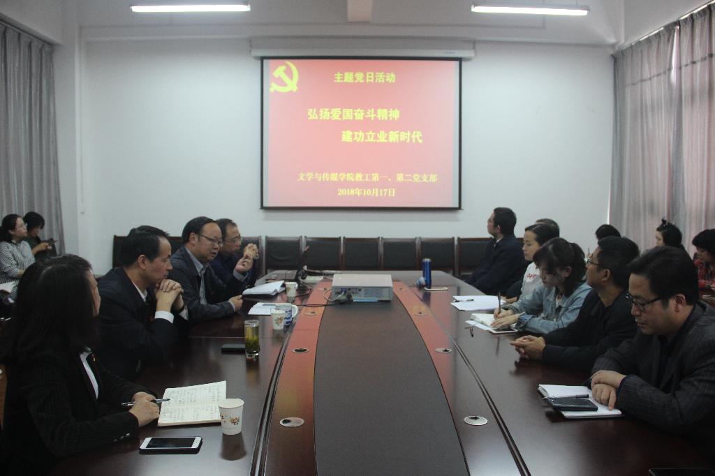 10月17日下午,我校文学与传媒学院教工第一、第二党支部在陕南民间文化研究中心会议室联合开展“弘扬爱国奋斗精神 建功立业新时代”主题党日活动。文传学院教工第一、二党支部全体党员以及非党员教师、学生第一、二党支部书记参加了此次活动,活动由教工第二党支部书记崔瑜主持,学校党委书记王国良以普通党员身份全程参与活动。