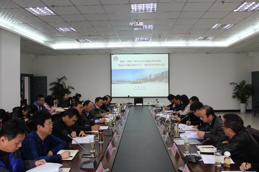10月26日上午,陕西(高校)哲学社会科学重点研究基地“陕南乡村振兴研究中心”建设任务专家论证会在我校江北校区逸夫科技楼九楼会议室召开。陕西省社会科学院科研处处长、研究员王建康,西北农林科技大学经济管理学院教授、博导朱玉春,西安电子科技大学马列学院教授、博导曹飞,陕西理工大学经法学院院长、教授胡仪元,安康市委党校副校长王彦青,安康市农业局副局长鲁延柱,安康市委政策研究中心副主任萧诚;我校党委副书记杨行玉,发展规划处处长谢安国,陕南乡村振兴研究中心主任、政社学院院长何家理及相关院系负责人等30多人参加了论证会。科研处副处长王刚主持论证会。
