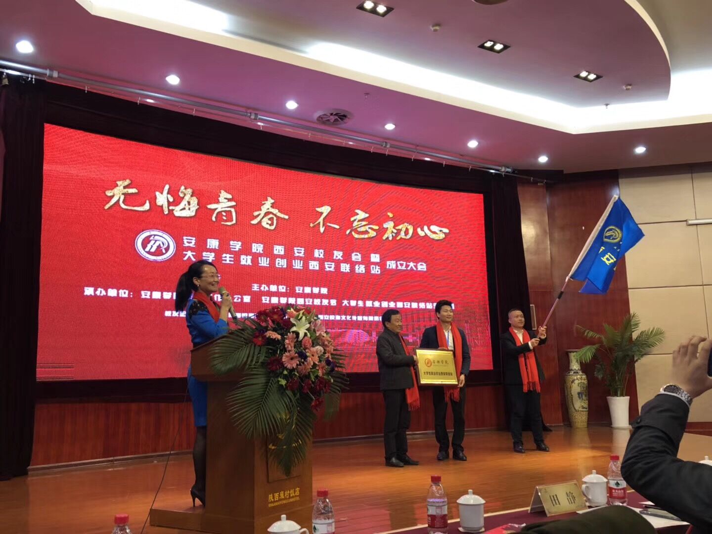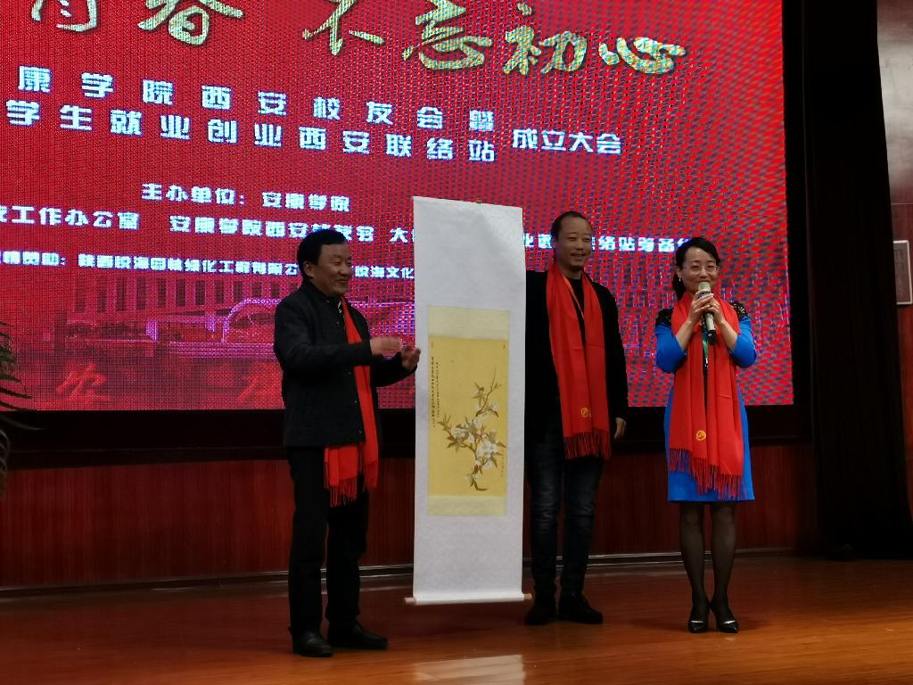 钟生海为西安校友会授旗,为安康学院大学生就业创业西安联络站颁发牌匾。