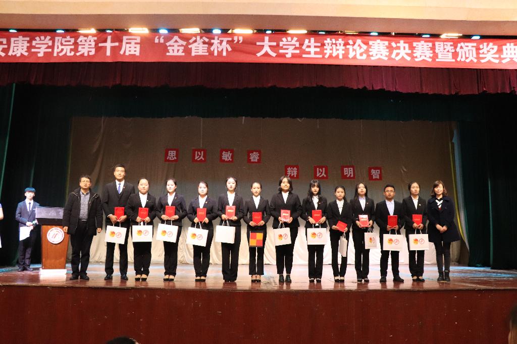 为提高我校大学生语言表达和逻辑思辨能力,培养青年学生的创新意识和团队精神,推进我校校风、学风建设,营造明理思辨的大学文化氛围,由校团委、教务处联合举办的安康学院第十届“金雀杯”大学生辩论赛经过半个多月的角逐,于11月16日晚在江南校区大礼堂迎来了决赛,学校党委副书记胡波莅临决赛现场并出席了颁奖典礼。党政办副主任周云、组织部副处级组织员车静、统战部副部长韩晔、学工部副部长黄娟、教务处副处长付争方、招就处副处长常权记、思政教研部副主任吴亚娥等担任决赛评委。共计500余名师生参加了本次活动。