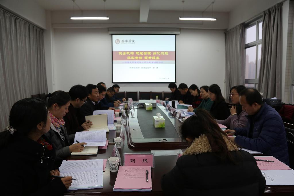 座谈会上,张亮介绍了本次巡检评估的目的和意义。钟生海代表学校对专家组一行表示热烈欢迎,感谢专家组对我校普通话测试和语言文字工作的大力支持,也恳请专家组通过实地考察多提宝贵意见和建议,给予更多指导,帮助我校进一步提升普通话水平测试管理工作。教务处处长余谦从测试站基本情况、组织及工作机构、测试员队伍建设和测试过程管理等方面,以《健全机构 规范管理 细化流程 落实责任 提升服务》为题,向专家组做了工作汇报。