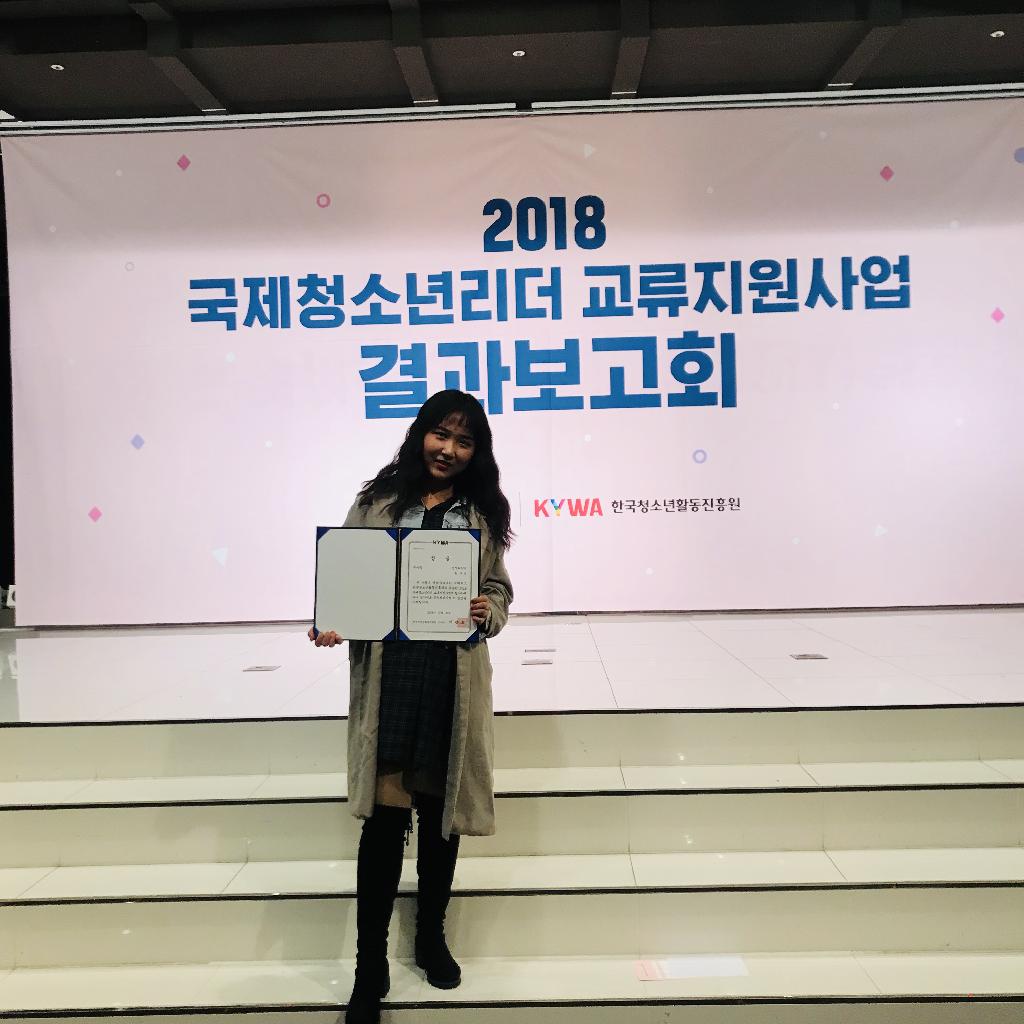 据悉,韩国“2018国际青少年领导交流支援事业综合结果报告会”是由韩国女性家族部(大韩民国国家行政机关之一)主办,主要针对赴韩国留学生不断增加的趋势,组织在韩留学生和韩国本国大学生进行广泛交流的项目。今年共有韩国14所大学, 34个国家约的留学生共1300多名大学生参加了此次活动,活动包括文化讲座、歌唱比赛、发表演讲、文化探访等,旨在加深多国青少年间的了解和沟通。我校陈可亲同学在活动中表现突出,获得一致好评并得到奖励。韩国庆星大学国际处特向我校发来邮件报喜并表达希望我校更多优秀学子赴庆星大学交换学习的愿望。