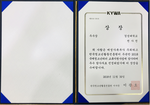 近日,从我校友好学校韩国庆星大学传来喜讯,在11月30日于韩国釜山举行的 “2018国际青少年领导交流支援事业综合结果报告会”上,我校2016级会计专业交换生陈可亲代表韩国庆星大学参赛并荣获韩国青少年活动振兴院理事长奖,展现了我校学子综合素质高、视野开阔、积极融入全球文化交流的良好风貌。