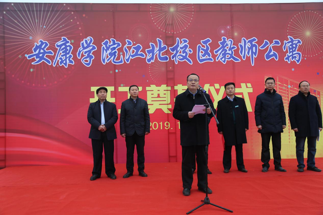 仪式上,丁巨涛代表学校致辞。他表示,江北校区教师公寓楼项目既是安居工程,更是高层次人才引进“筑巢”工程。工程的建成,将有效缓解学校教职工住房压力,显著改善教职工住房条件,同时对学校高层次人才引进工作,加强江北校区稳定安全管理等工作具有十分重要的意义。同时,丁巨涛强调,希望参与项目建设的设计单位、建设单位、监理单位以及学校相关部门,发扬工匠精神,科学管理、精心施工、紧密配合,以工程质量为百年大计,确保工程如期顺利竣工,把教师公寓建设成为精品工程、样板工程,给学校职工和历史交一份满意的答卷,为安康学院再添一道靓丽的风景。