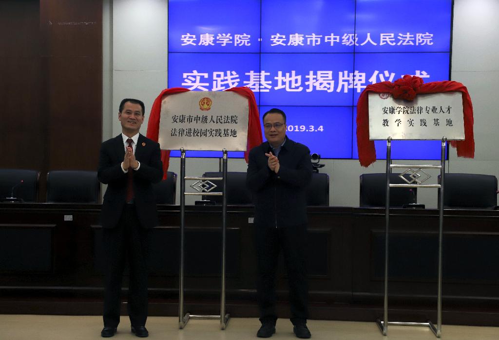 仪式伊始,丁巨涛、葛迪为“安康学院法律专业人才教学实践基地”、“安康市中级人民法院法律进校园实践基地”两个基地揭牌。