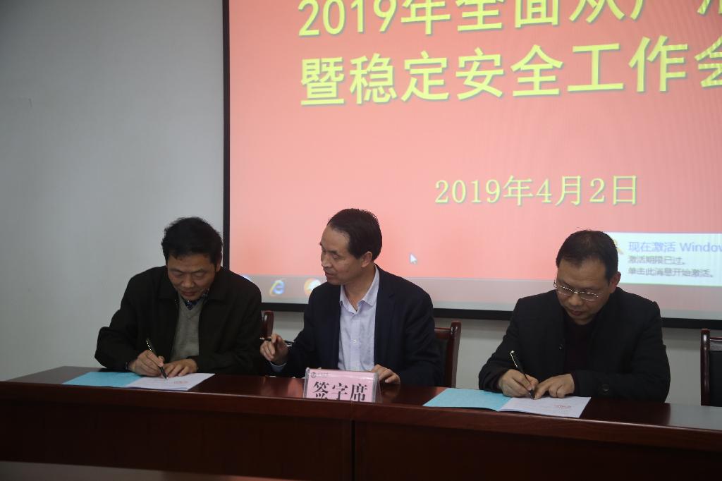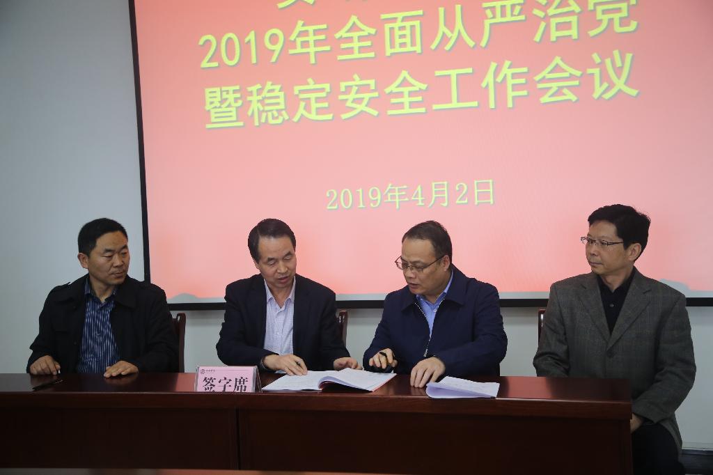 三是要强化担当,改进作风,保障全面从严治党和稳定安全工作各项任务落到实处。签订责任书,既是一项十分庄重的承诺,更是一个沉甸甸的责任,广大干部要强化责任担当,认真学习关于落实全面从严治党制度文件,理解精神,把握要求,切实将工作做到实处;改进工作作风,以严和实的作风,推动工作作风改变,给全校师生展现更好的工作状态;加大督办督查和追责问责力度,以责任追究促进履责到位,推动全面从严治党和稳定安全主体责任在学校落地有效,保障和推动学校各项工作2019年再上新台阶。