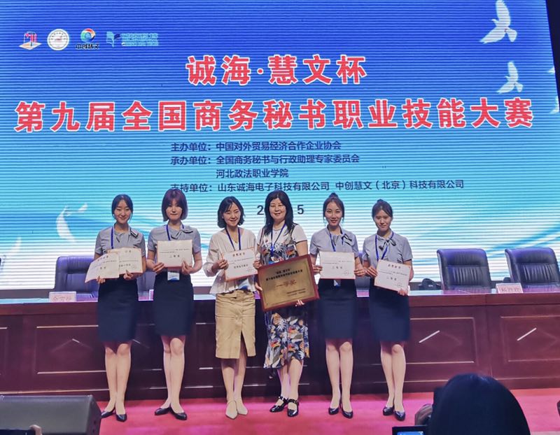 5月17日—19日,“诚海·慧文杯”第九届全国商务秘书职业技能大赛在河北政法职业学院隆重举行。本次大赛内容包括秘书事务处理、秘书工作展示两大模块,由秘书专项事务处理、秘书综合事务处理、汇报展示、秘书工作情境展示四个实践性项目组成。由我校文传学院况汉英、邸玲老师带队指导学生参赛,经过激烈角逐,李雨、党卓文、杨彩艺、杨琳倩组成的参赛队荣获团体一等奖,4名成员均获得个人综合二等奖。