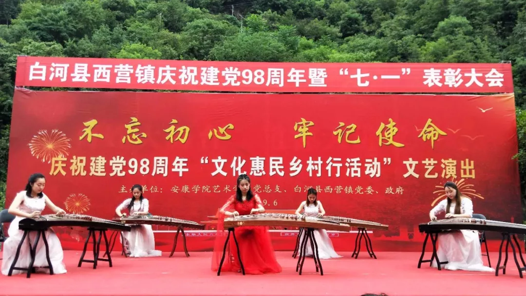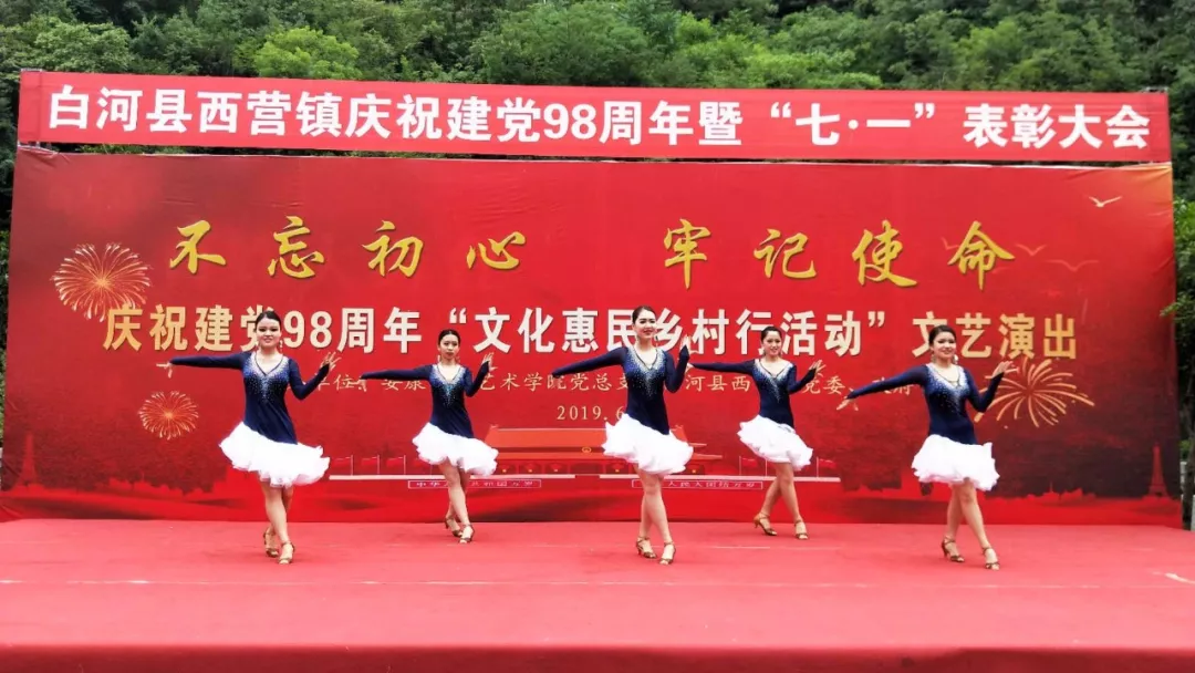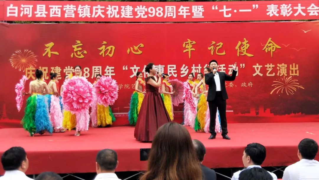 为认真学习贯彻习近平总书记关于扶贫工作的重要论述和“不忘初心,牢记使命”重要讲话精神,落实省委教育工委“双百工程”中“提质增效”的要求和学校党委对“双百工程”文化惠民的决策部署,6月21日上午,我校艺术学院党总支和西营镇党委、政府在西营镇天逸广场隆重举办“不忘初心、牢记使命”庆祝建党98周年“文化惠民乡村行”文化交流活动,3000余名干部群众参加了本次活动。