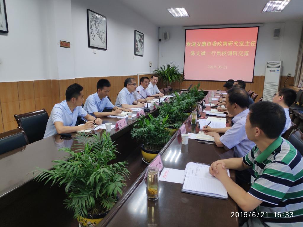 6月21日下午,安康市委政策研究室主任陈文斌一行到我校调研交流校地合作事宜。学校党委副书记杨行玉,党政办、陕南民间文化研究中心、陕南乡村振兴研究中心和陕南生态经济研究中心相关负责人、专家参加会议。