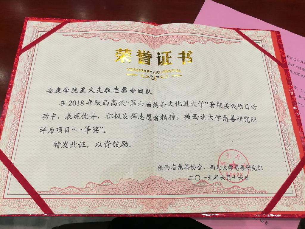 仪式上,省慈善协会对2018年陕西高校“阳光爱心行动.慈善文化进大学”专项活动优秀项目进行了表彰,我校星火支教队荣获2018年第六届“慈善文化进大学”暑期实践项目活动一等奖。