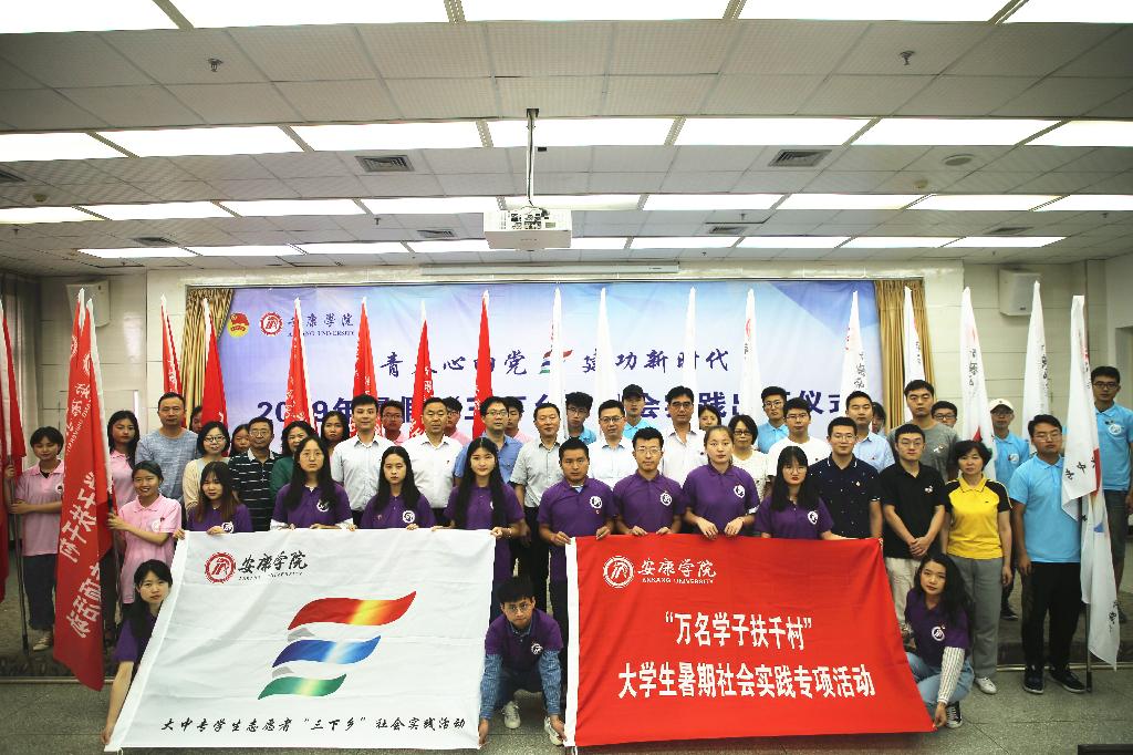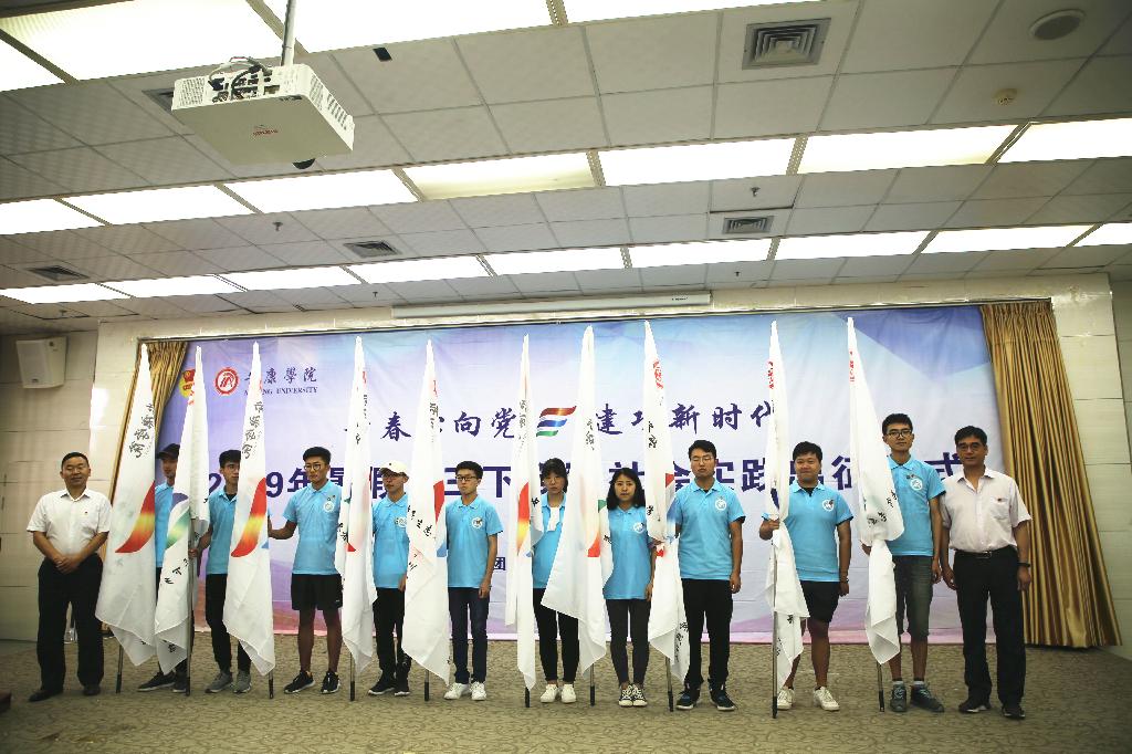 出征仪式在中国共青团团歌《光荣啊,中国共青团》奏唱声中拉开帷幕。会上,文传学院指导教师邹棠华与体育学院学生代表杜宇涛进行了经验交流和分享;教务处处长余谦宣布了2019年校级重点团队名单;与会嘉宾分别为“三下乡”重点团队及“万名学子扶千村”专项团队授旗。