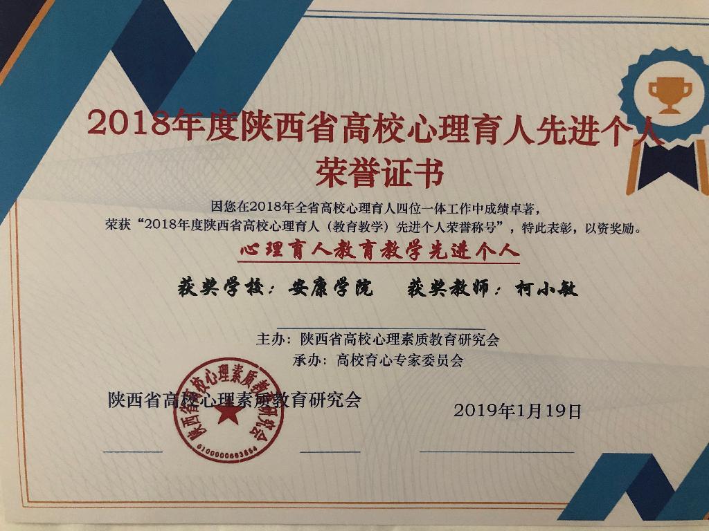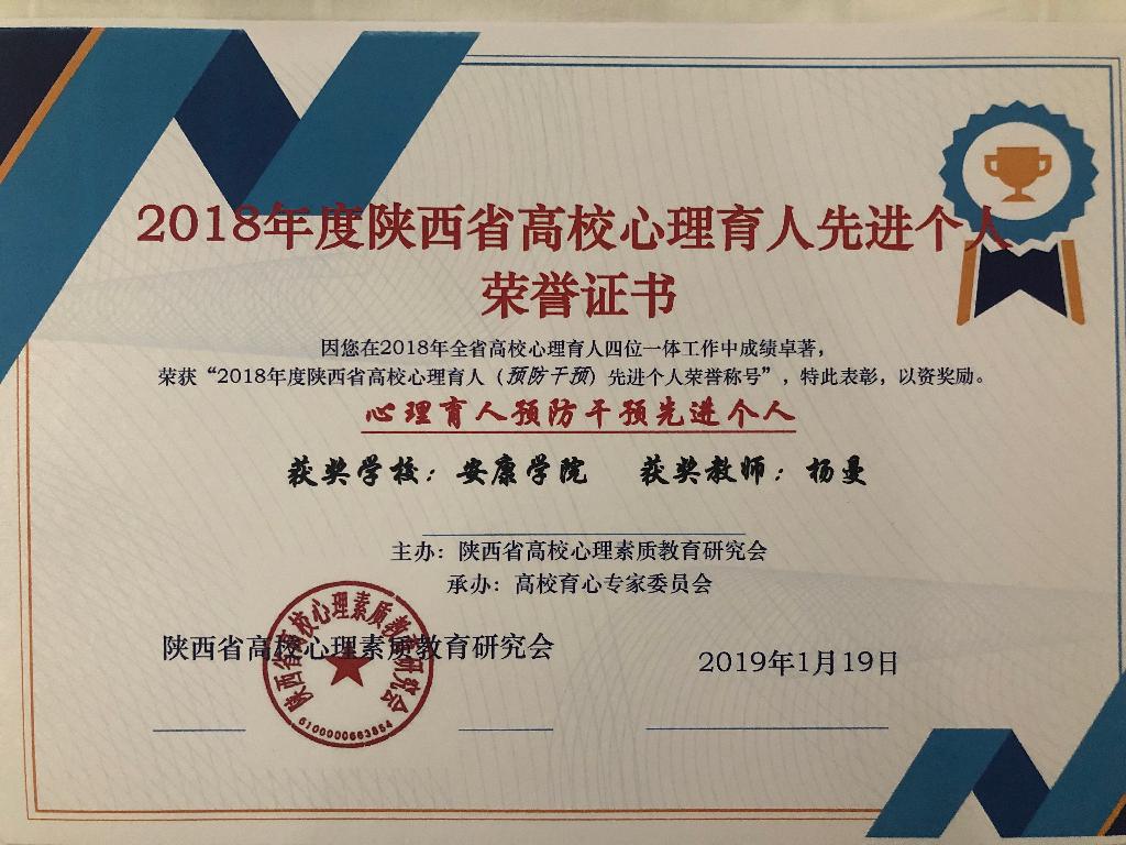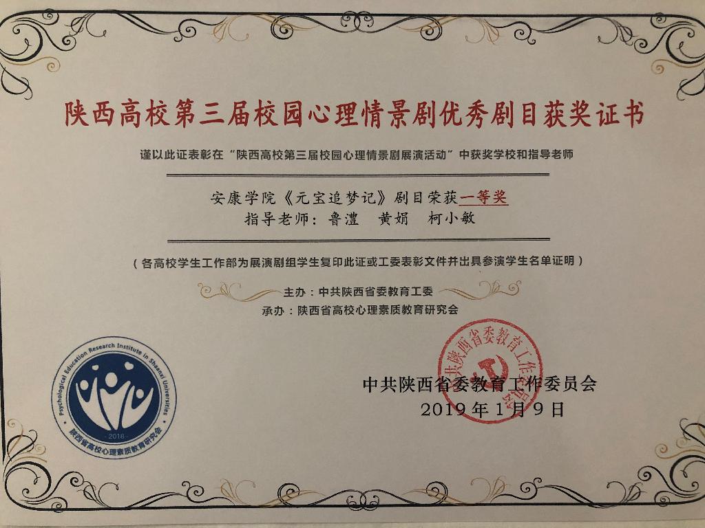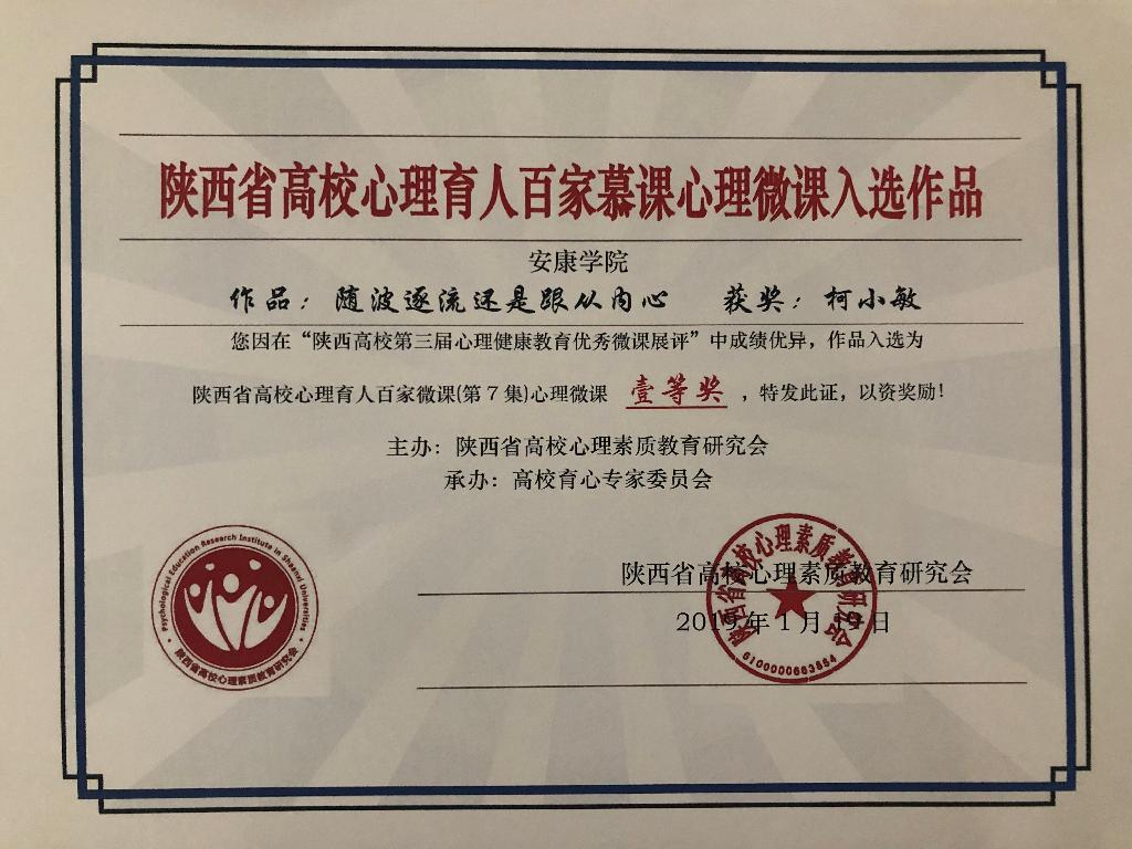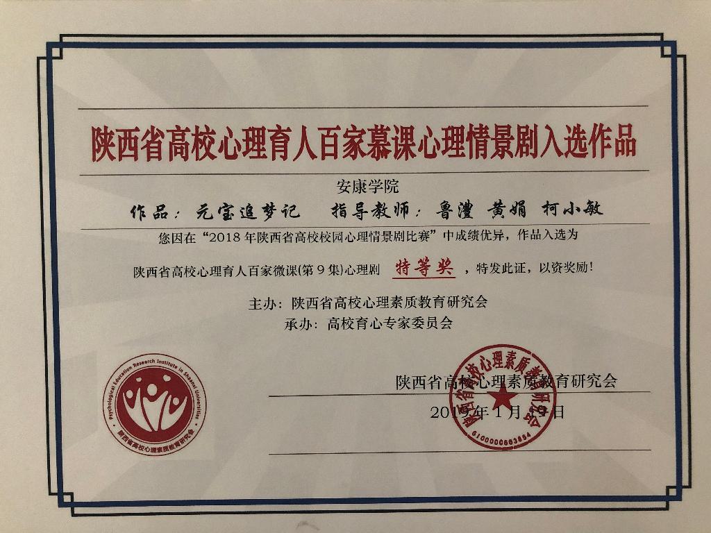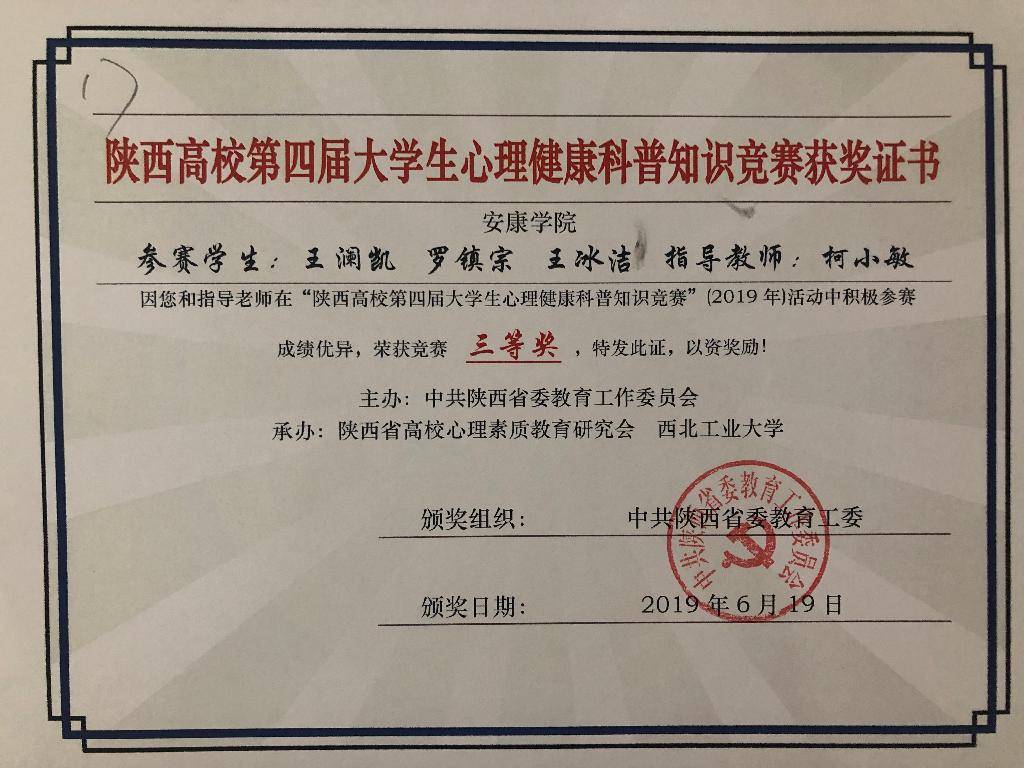 会议全面总结了陕西高校第四届“阳光护航”心理育人宣传季活动成效,对心理育人工作中的优秀单位和个人进行了表彰。我校在本次表彰会议上获多项荣誉:大学生心理健康教育中心副主任柯小敏、农生学院辅导员杨曼在2018年全省高校心理育人四位一体工作中成绩卓越,分别荣获“陕西高校心理育人教育教学先进个人”与“陕西高校心理育人预防干预先进个人”称号;在2016-2019年陕西省高校心理育人大数据调研分析工作中,我校大学生心理健康教育中心统筹协调,各二级学院认真组织、规范采集,保证了数据真实、有效,被评为“优秀采样单位”;在心理情景剧展演、优秀心理微课评选、心理健康科普知识竞赛活动中,我校获得特等奖1项,一等奖2项,二等奖1项,三等奖1项。