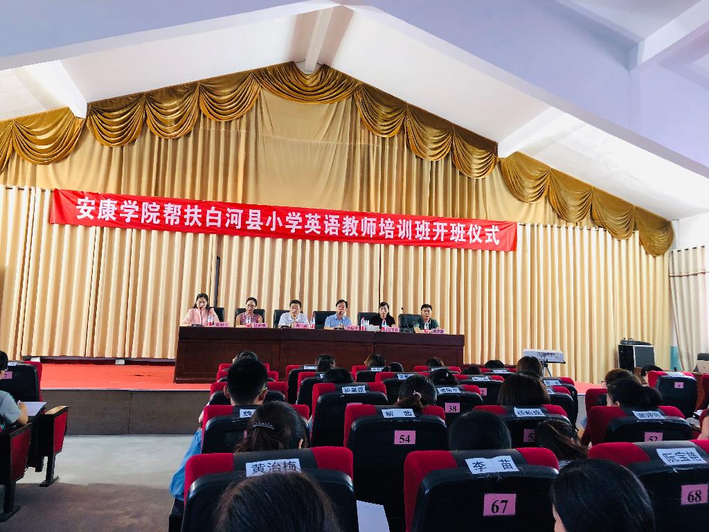 7月15日上午,安康学院帮扶白河县小学英语教师培训班开班仪式在白河县城关镇中心小学举行。活动由白河县教研室主任唐明玉主持,白河县教体与科技局副局长黄涛、外语学院副院长张哲华、安康市小学英语教学研究会副理事长江利侠、汪玉桂等出席开班仪式。白河县全体小学英语教师参加了开班仪式。