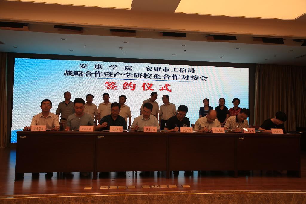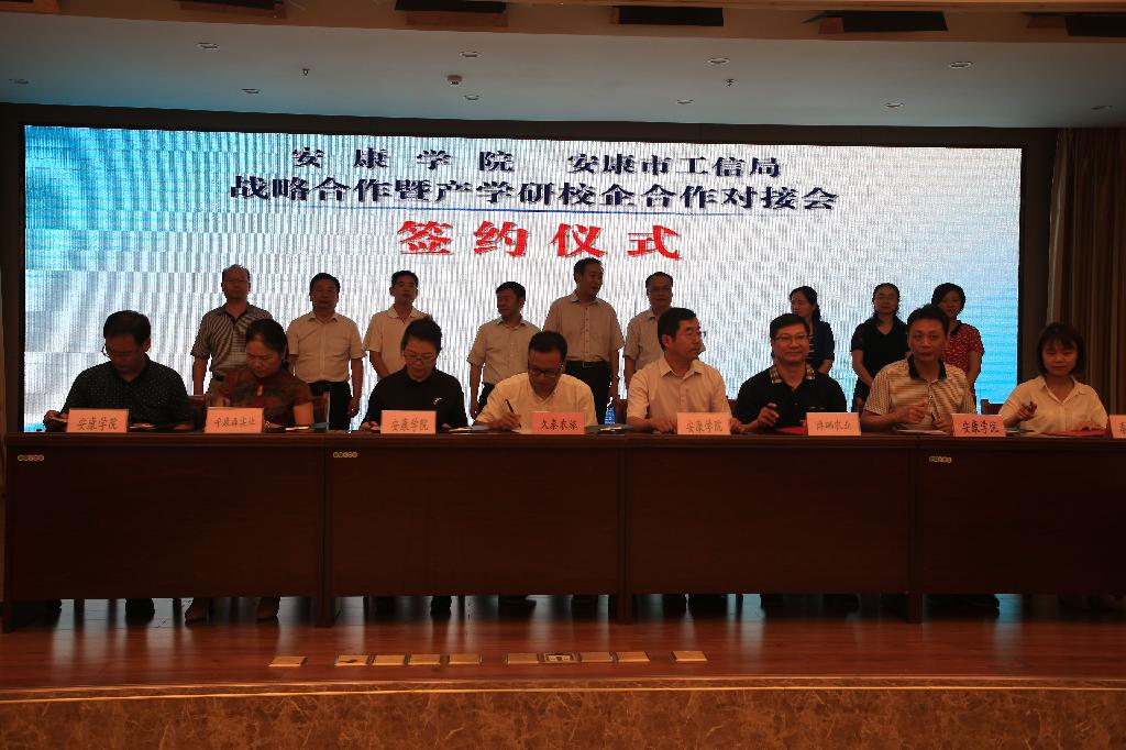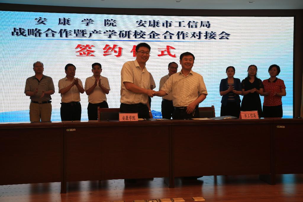 在与会代表共同见证下,我校与安康市工信局签署了《安康学院、安康市工信局战略合作协议》,同时还与8家企业签署了框架合作协议,与3家企业签署了3项横向合同25万,意向合同90万。