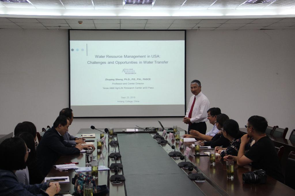 课题组成员、美国德克萨斯州农工大学盛祝平教授作了《美国水资源管理挑战与机遇》的报告,对水资源管理前沿问题进行了详细论述,为区域水资源管理提供了思路。杨永辉研究员对我校在汉江水资源保护和利用问题上所作的工作表示赞赏和肯定,并表达了和我校在南水北调水源地水资源保护问题上展开多方面合作的良好愿景。