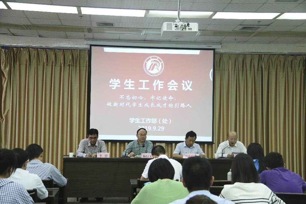 9月29日下午,我校在江南校区图书馆六楼报告厅召开主题为“不忘初心、牢记使命,做新时代学生成长成才引路人”学生工作会议,学校党委副书记杨行玉、副校长钟生海出席会议并讲话,学工部、招就处负责人、各二级学院党总支书记、全体辅导员参加会议。会议由杨行玉主持。