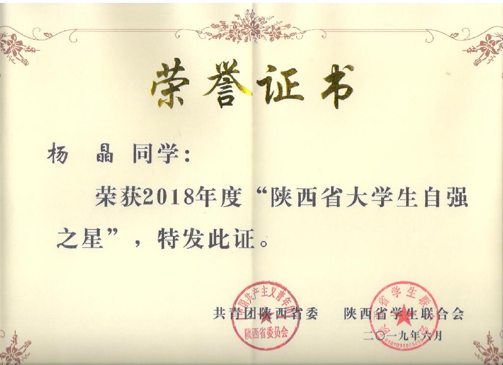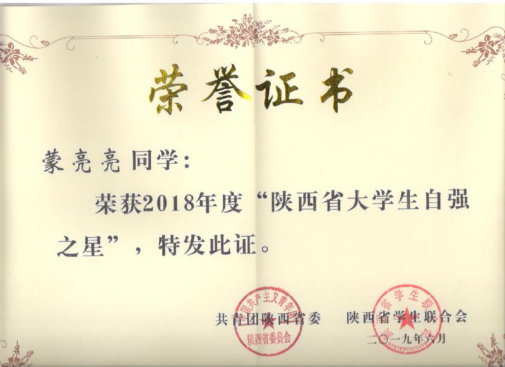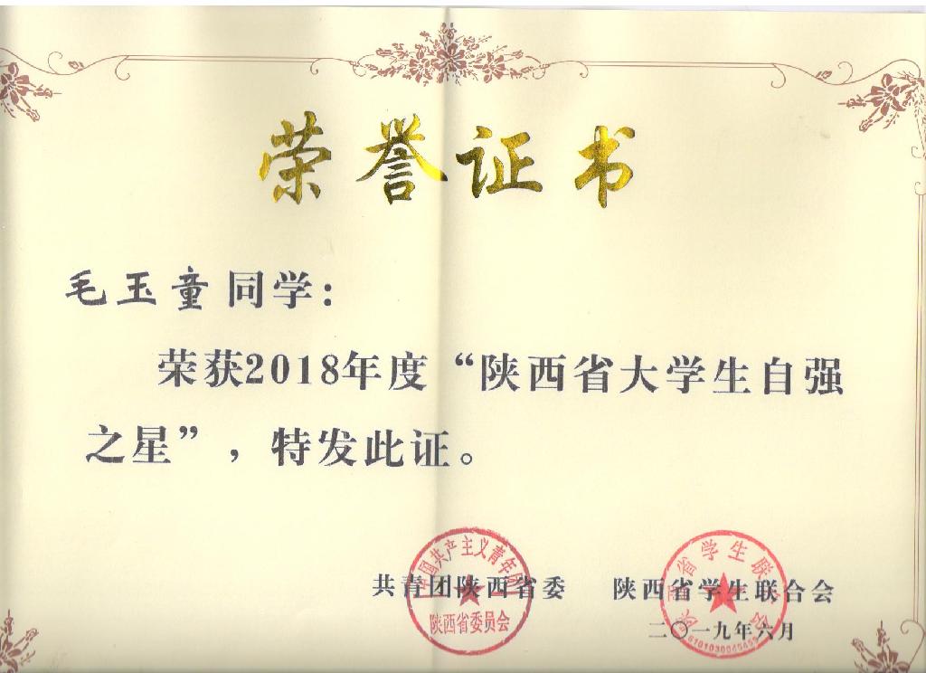 近日,由共青团陕西省委组织开展的寻访“陕西省大学生自强之星”活动结果揭晓,我校毛玉童、蒙亮亮、杨晶3名同学荣获2018年“陕西省大学生自强之星”称号。