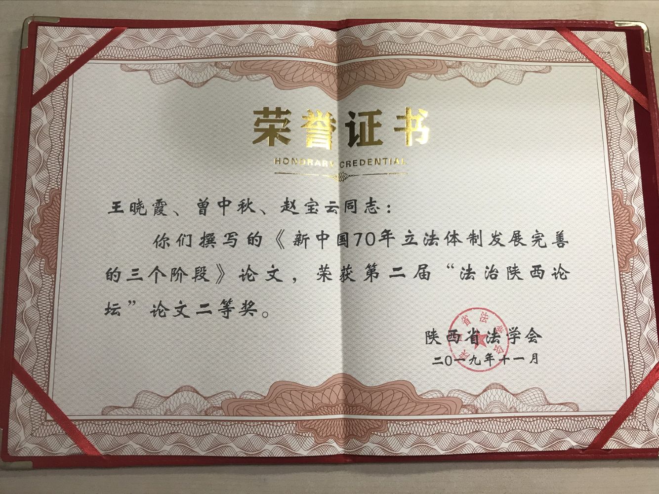 近日,由省法学会、西北政法大学、西北大学主办的第二届“法治陕西论坛”在西安开幕。省委常委、省委政法委书记庄长兴,省政协副主席、省法学会会长祝列克出席论坛并讲话。大会表彰了第二届“法治陕西论坛”获奖论文作者及优秀单位,我校马克思主义学院教师王晓霞、曾中秋、赵宝云撰写的《新中国70年立法体制发展完善的三个阶段》荣获二等奖。