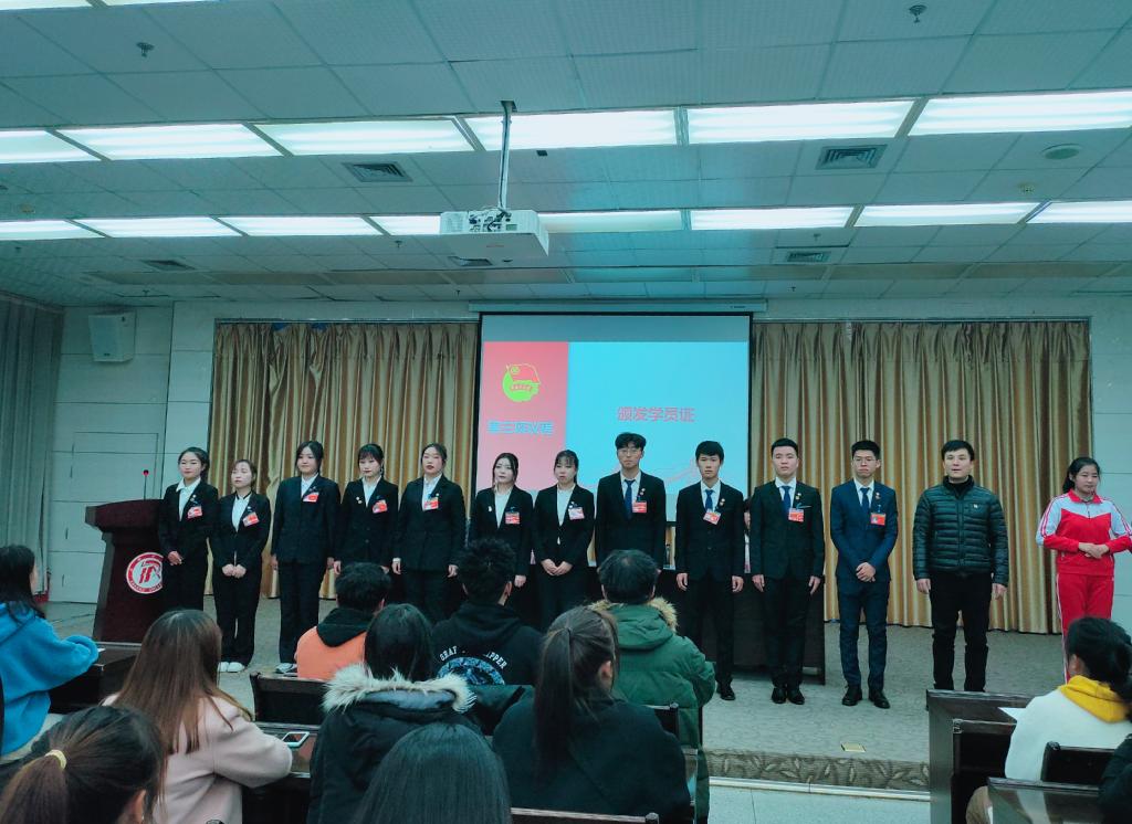 开班仪式在激情澎湃的团歌奏唱声中正式开始。黄娟宣读了本期培训班培训方案,对培训的目的意义、课程安排、参训纪律等情况作了具体的说明;李光梓为青马班的学员代表颁发学员证;教育学院陈雨露和电信学院邹星昱两位同学代表参训学员作了表态发言。