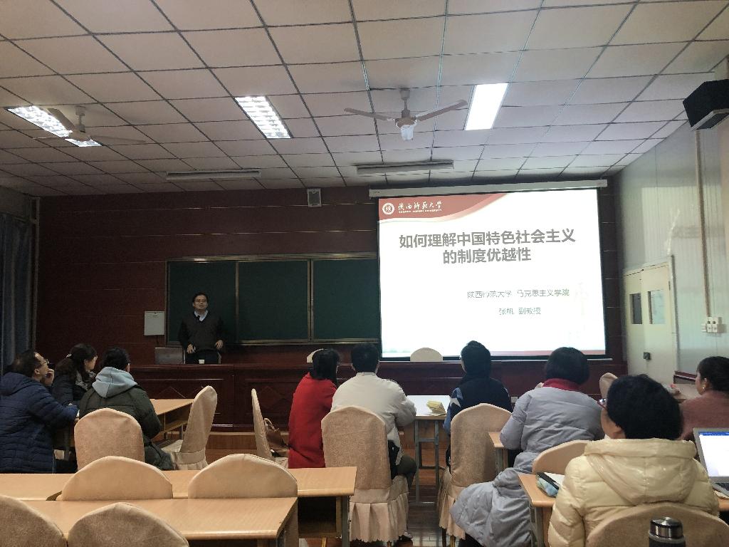 为充分发挥优秀教师示范带头作用,促进教师之间的相互学习与交流,提高我校教师的教学能力和教学水平,推动思政课教学改革,近日,我校特邀陕西师范大学马克思主义学院张帆副教授,在江南校区1018教室做题为《怎样理解中国特色社会主义的制度优越性》的公开示范课。各二级学院教学副院长、系主任、教学骨干、部分思政课教师参加了此次活动。