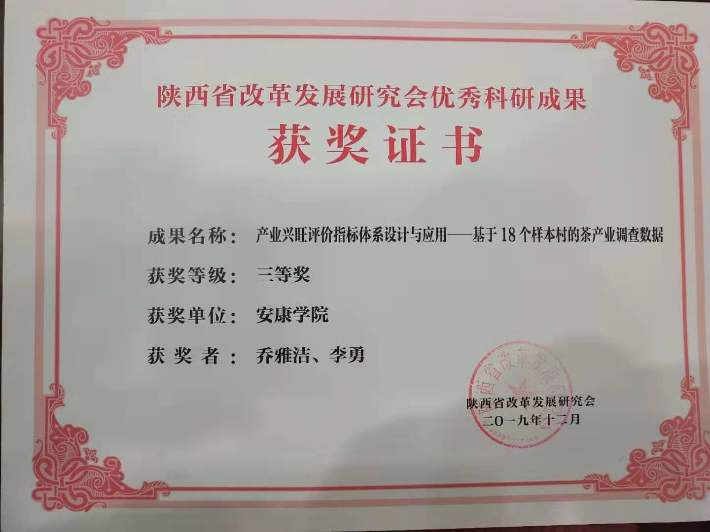 会上举行了陕西省改革发展研究会优秀科研成果奖颁奖仪式,我校赵临龙教授著作《中国中西部南北旅游大通道的构建研究》荣获特等奖,经管学院乔雅洁、李勇的合著论文《产业兴旺评价指标体系设计与应用——基于18个样本村的茶产业调查数据》荣获三等奖。