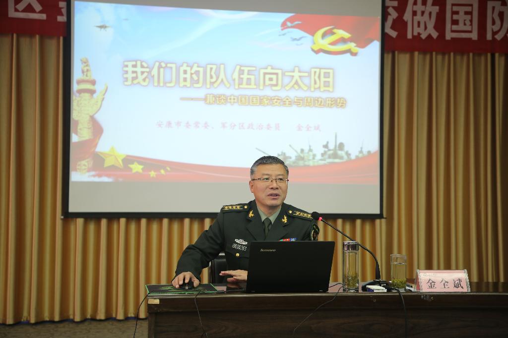 为进一步推进我校军事课教学改革,加强我校学生的国防安全意识,近日,我校特邀安康市委常委、安康军区政治委员、陕西省军区党委委员金全斌大校,在江南校区图书馆6楼报告厅作了题为《我们的队伍向太阳—兼谈国家周边形势》报告会。我校国家安全人民防线建设小组成员及学生代表等200余人参加了此次报告会,报告会由校党委副书记杨行玉主持。