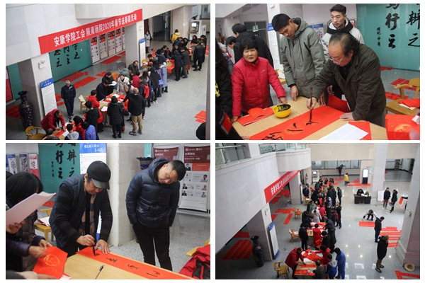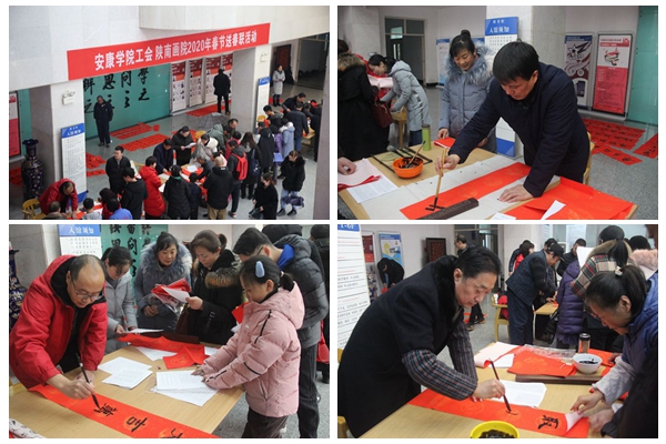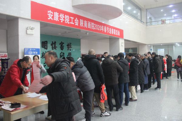 2020春节将至,为营造节日欢庆氛围,弘扬民族传统文化,1月8日,安康学院工会组织开展了为教职工义务书写春联活动。工会专职副主席王斌、陕南画院院长章长青及该院书法成员杨润波、张富华、张纪生、梅向东等同志及教职工参加了活动。