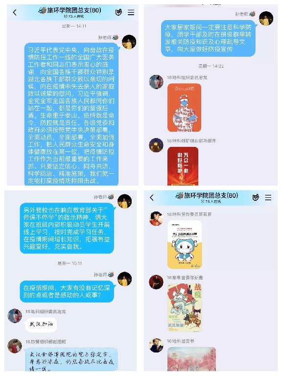 旅环学院积极开展“互联网+党团员教育”,上好使命与担当这堂大课。面对疫情,全院党员、团员积极行动,做疫情期间的守护者和志愿者。在学院党总支的指导下,学院各党支部、团总支积极开展特殊时期的线上主题党团日主题活动。一是学生党支部积极利用“学习强国”和“党员理论学习QQ群”开展线上微党课,加强学院党员的党性教育和厚植爱国主义情怀。学院学生党员、班干部更是利用寒假在家期间,主动利用所学知识,担当社区防护志愿者,为抗击疫情做出自己的贡献,显示新时代大学生的担当;二是要求每一位学生党员做好身份认同,提高政治站位,认真学习贯彻习近平总书记关于疫情防控的重要指示精神和讲话精神,贯彻落实党中央、国务院的决策部署,落实中省和校党委的工作要求,进一步增强“四个意识”、坚定“四个自信”、做到“两个维护”,积极发挥模范带头作用,结合实际需要投身到社区村组的抗疫宣传和排查工作中去,做好志愿者“守好一个卡,防好一个点”,在打赢疫情防控阻击战中敢担当有作为;三是加强对青年团员的思想引领。召开“抗疫有我,风雨同行”线上特别主题团日活动,以积极的引领、正确的疏导帮助青年团员树立战“疫”必胜的信心,加强网络思想教育和舆论引导,做好科学防疫宣传工作。