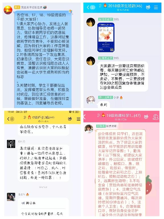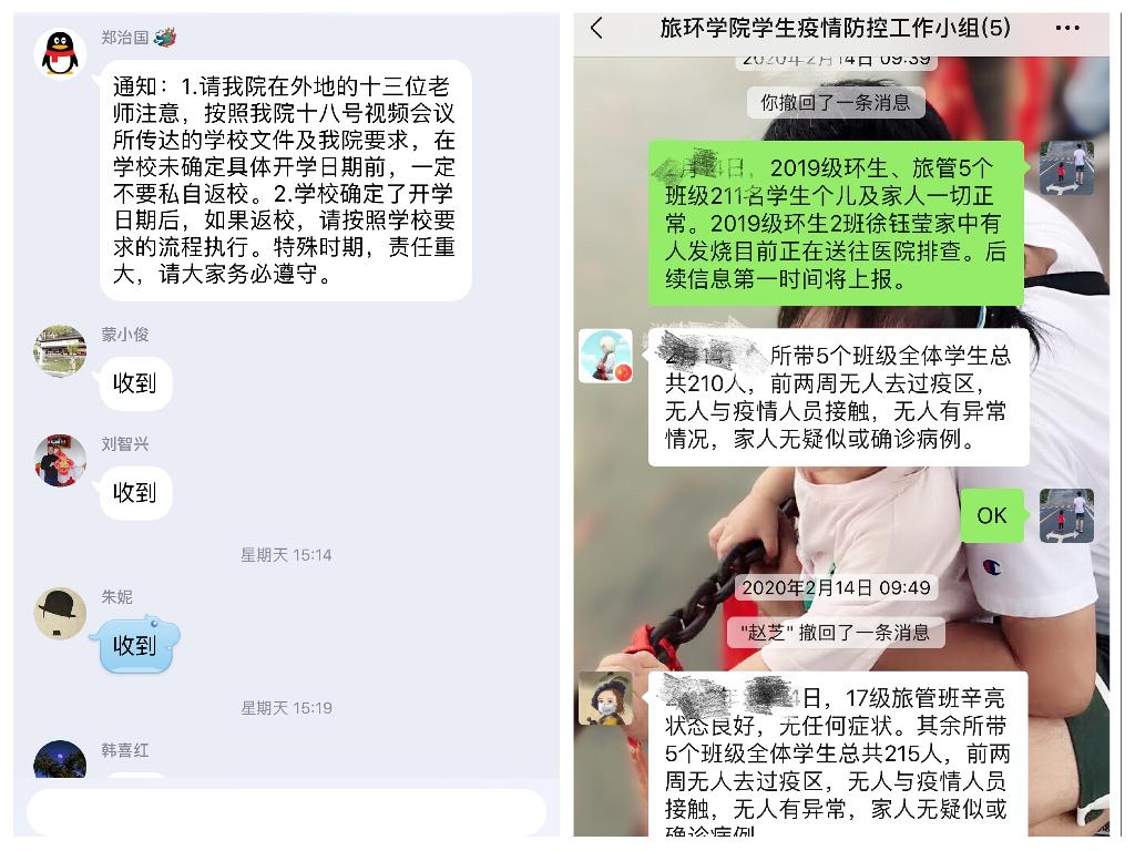 旅环学院党总支严格落实学校党委部署要求,高度重视疫情防控工作,根据学院实际情况制定了《旅环学院关于做好新型冠状病毒感染的肺炎疫情防控工作实施方案》,成立了以党总支书记、院长为组长的新型冠状病毒感染的肺炎疫情防控工作领导小组,强化组织保障和“第一责任人”意识,积极统筹协调学院领导班子成员、两办主任、系主任、辅导员参与学院疫情防控工作,通过“学院疫情防控工作领导小组——教师/学生疫情防控工作小组——班团干部疫情防控上报小组——学生个人及家属疫情反馈”四级疫情防控联防机制,分级分类落实防控措施,明确防控疫情是当前工作的重点,统筹做好开学前准备和疫情防控工作。学院疫情防控工作小组成员在疫情防控中充当着“指挥员”“信息员”“战斗员”“宣传员”和“服务员”的角色,每天通过QQ(微信)询问、电话跟进、平台记录等形式随时监督监测全院31名教师840名学生的疫情信息,做好精准统计、个别关注、按时上报有效信息。